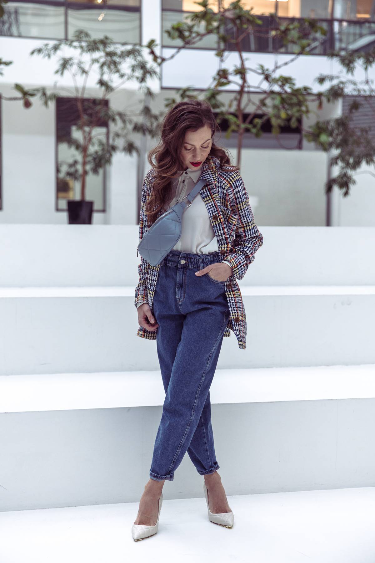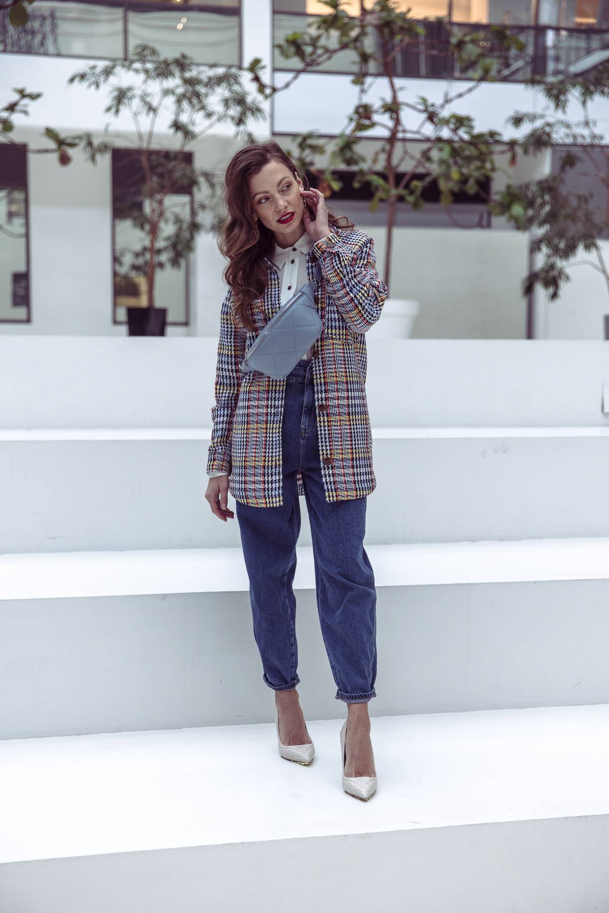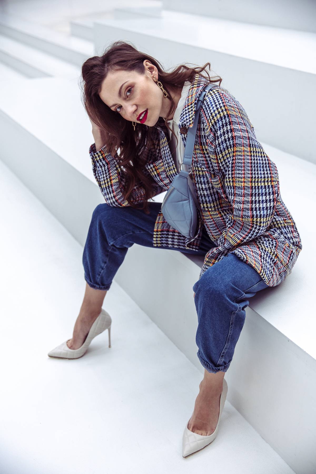 Na foto: náušnice (Pilgrim, prodává Zalando, 840 Kč); košile (Marks & Spencer, 699 Kč); svrchní košile (Culture, prodává Zalando, 3590 Kč), ledvinka (Reserved, 499 Kč); džíny (F&F, 649 Kč); lodičky (Steve Madden, prodává Answear, 2799 Kč)
