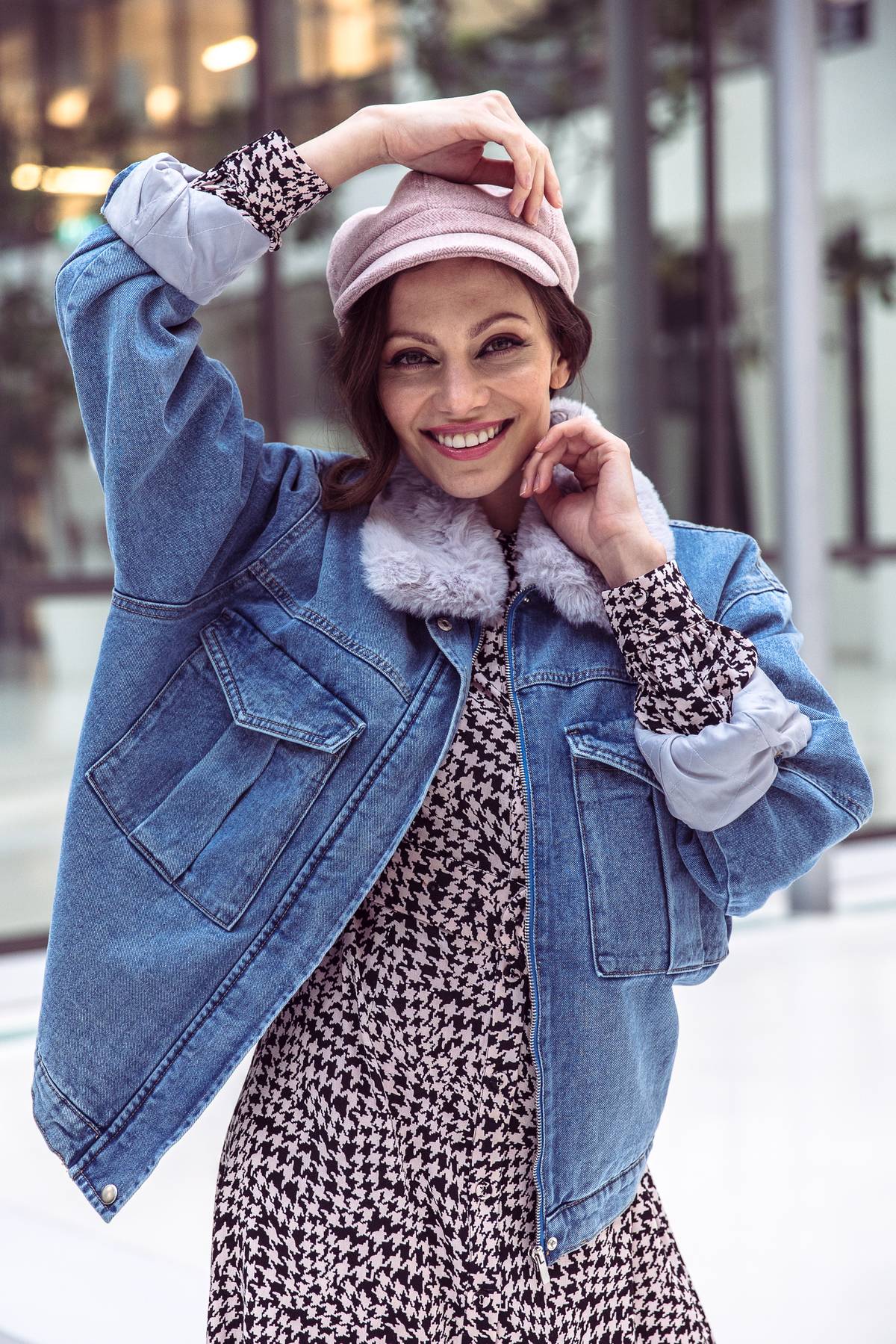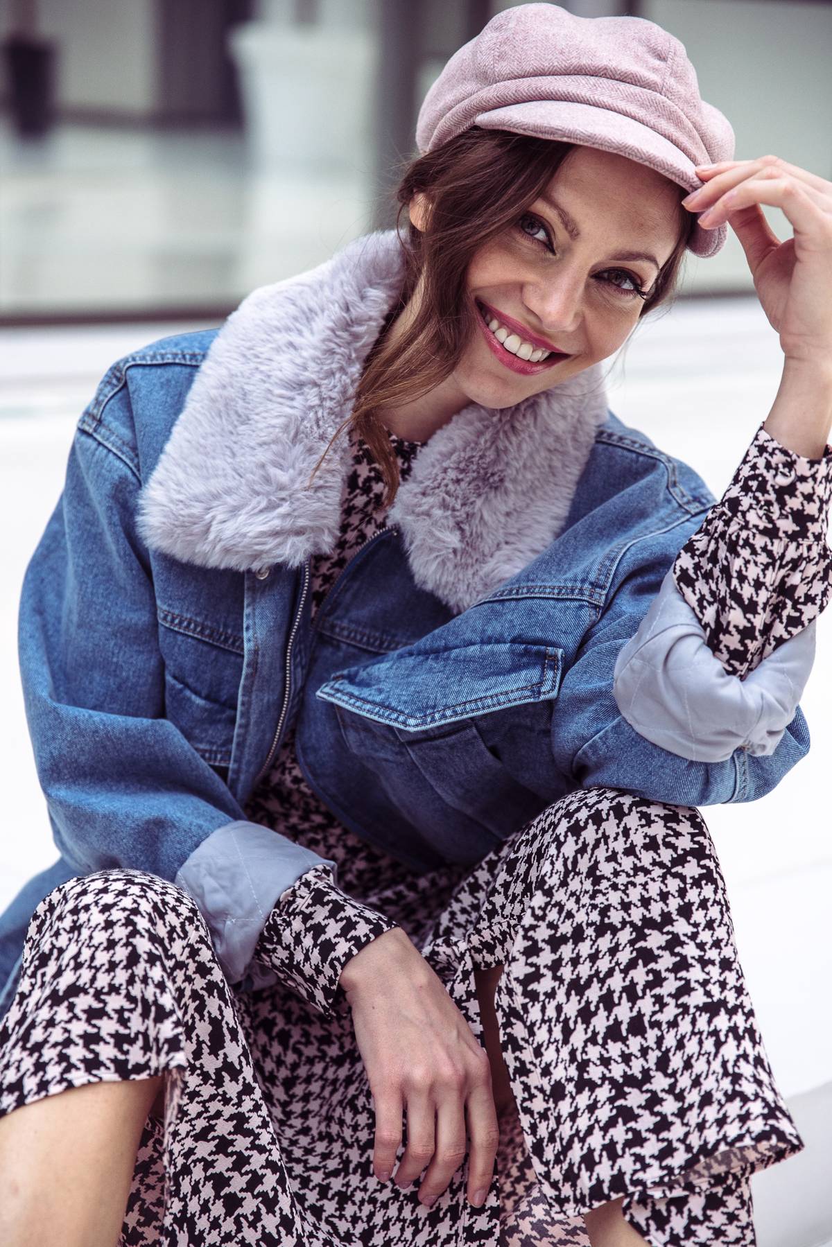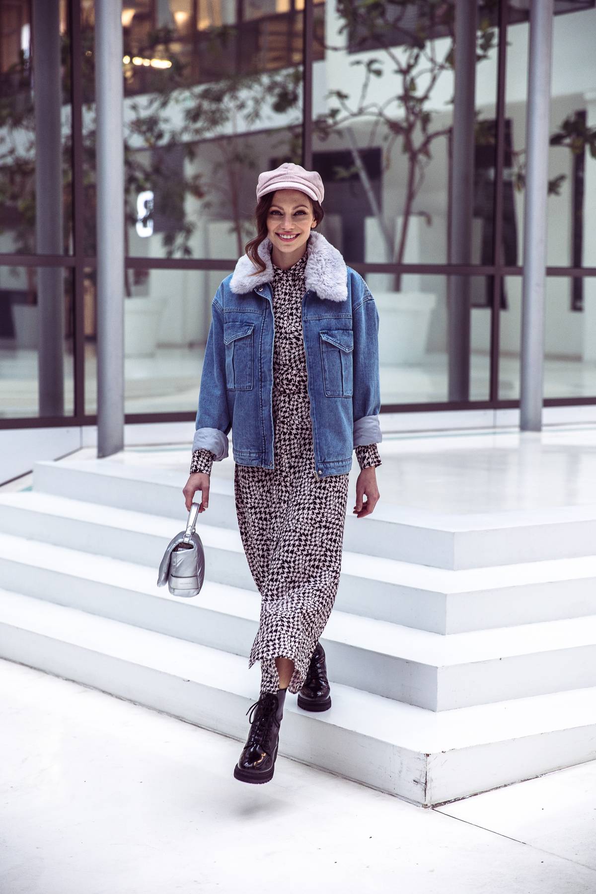 Na foto: čepice (Marks & Spencer, 599 Kč); džínová bunda (F&F, 999 Kč); šaty (Marks & Spencer, 899 Kč); kabelka (Karl Lagerfeld, prodává Vermont, 5809 Kč); boty (Deichmann, 1599 Kč)