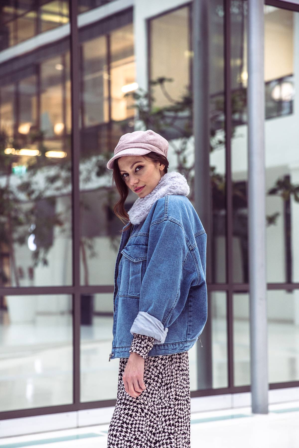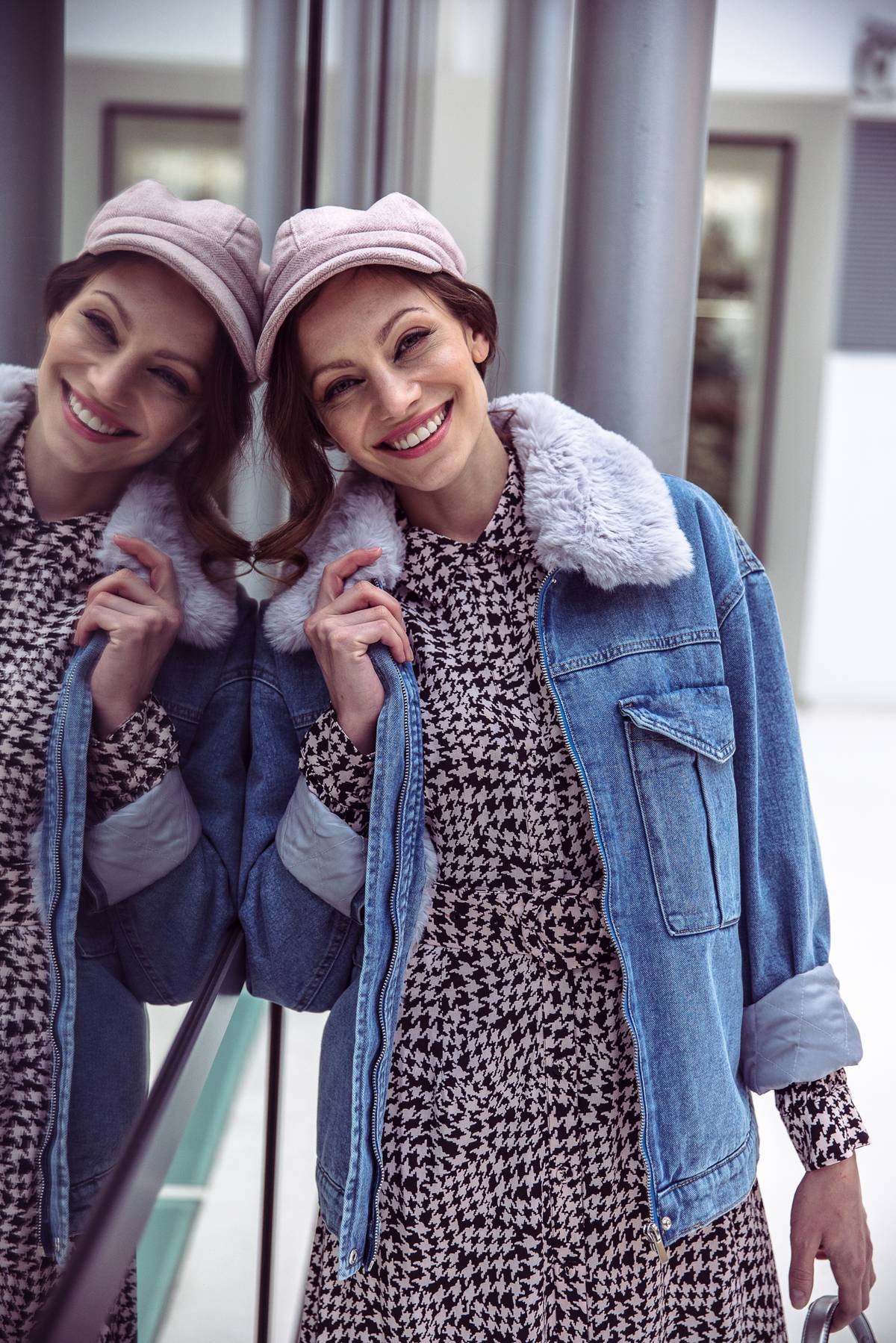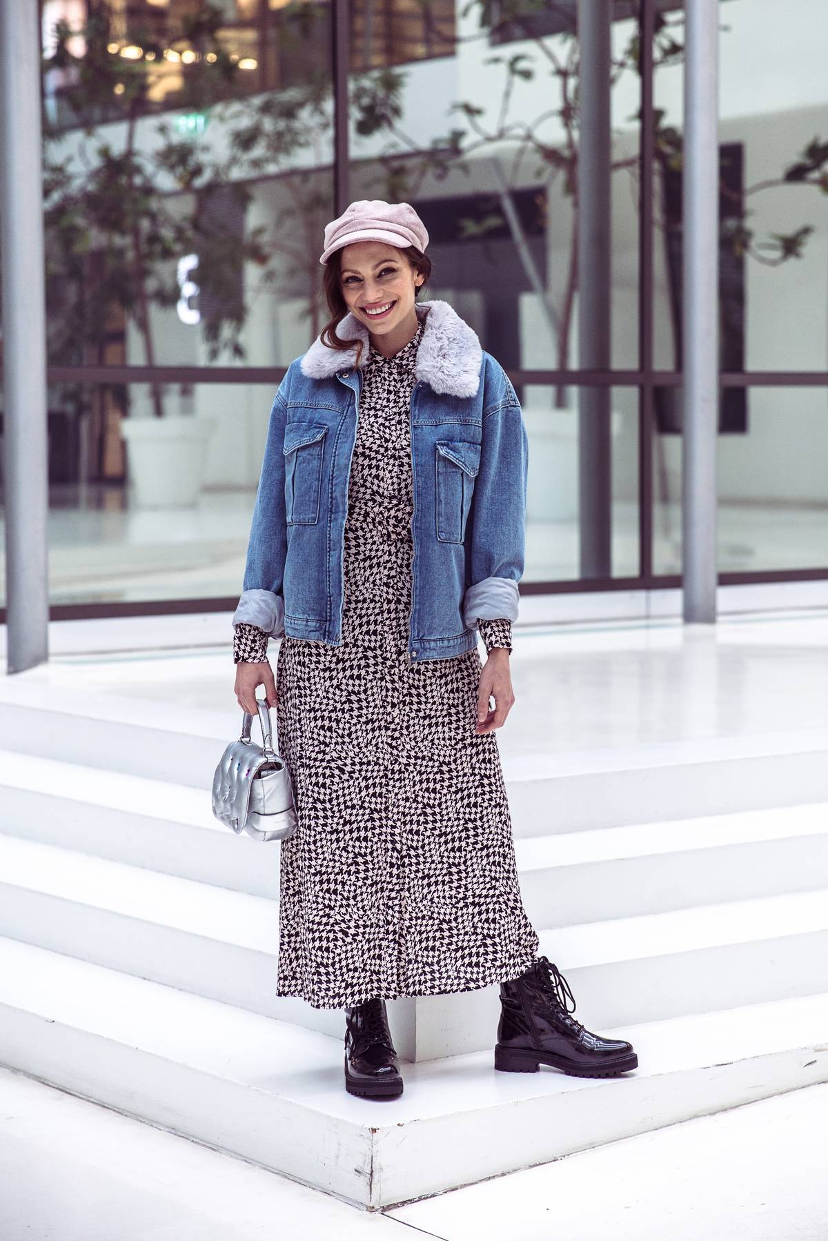 Na foto: čepice (Marks & Spencer, 599 Kč); džínová bunda (F&F, 999 Kč); šaty (Marks & Spencer, 899 Kč); kabelka (Karl Lagerfeld, prodává Vermont, 5809 Kč); boty (Deichmann, 1599 Kč)
