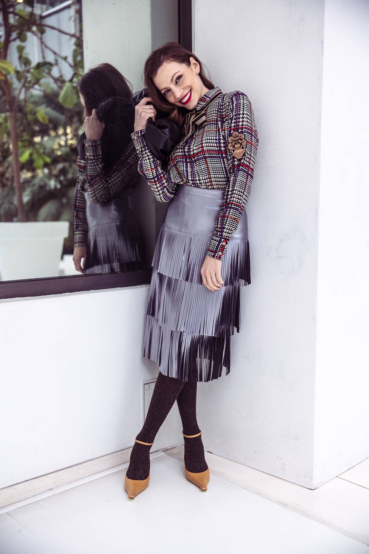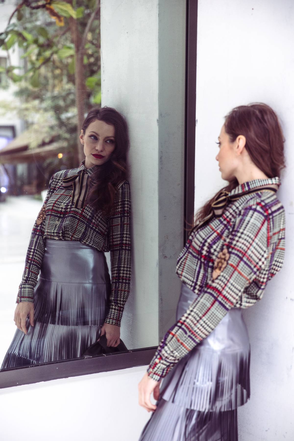 Na foto: sluneční brýle (Lindex, 299 Kč); halenka (La Martina, 3639 Kč); sukně (Karl Lagerfeld, prodává Vermont, 4479 Kč); kabelka (Lindex, 499 Kč); punčocháče (F&F, 149 Kč); lodičky (Mango, prodává Answear, 999 Kč)