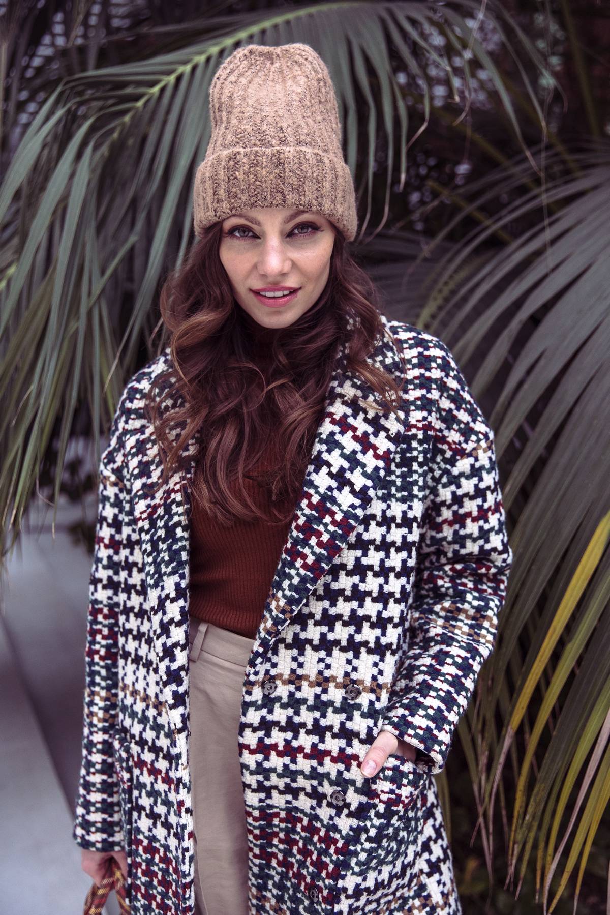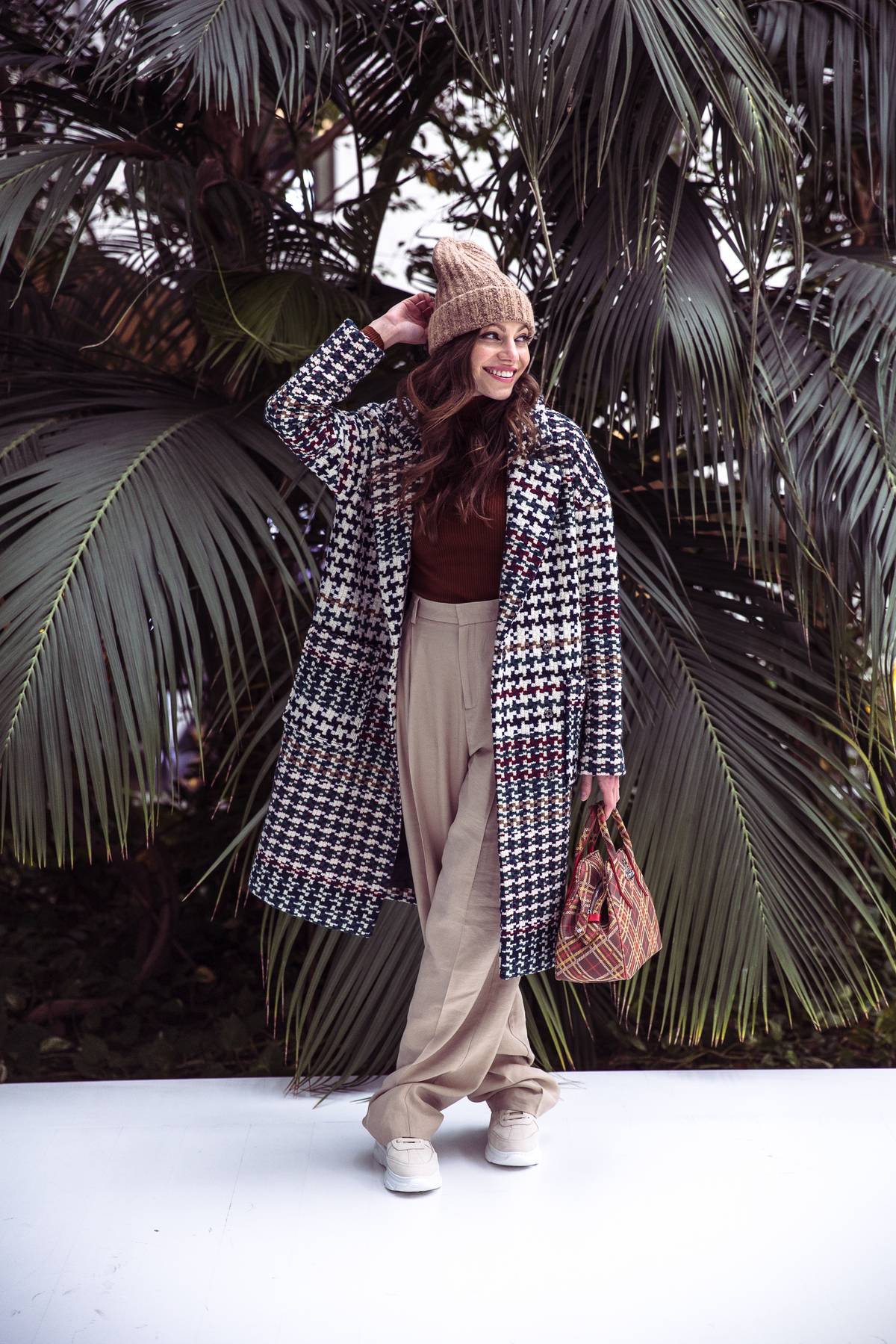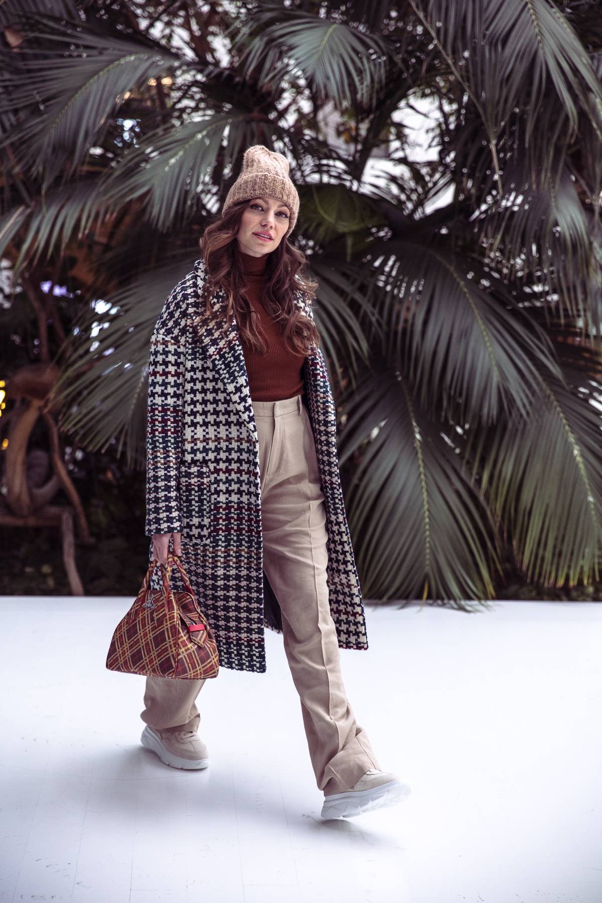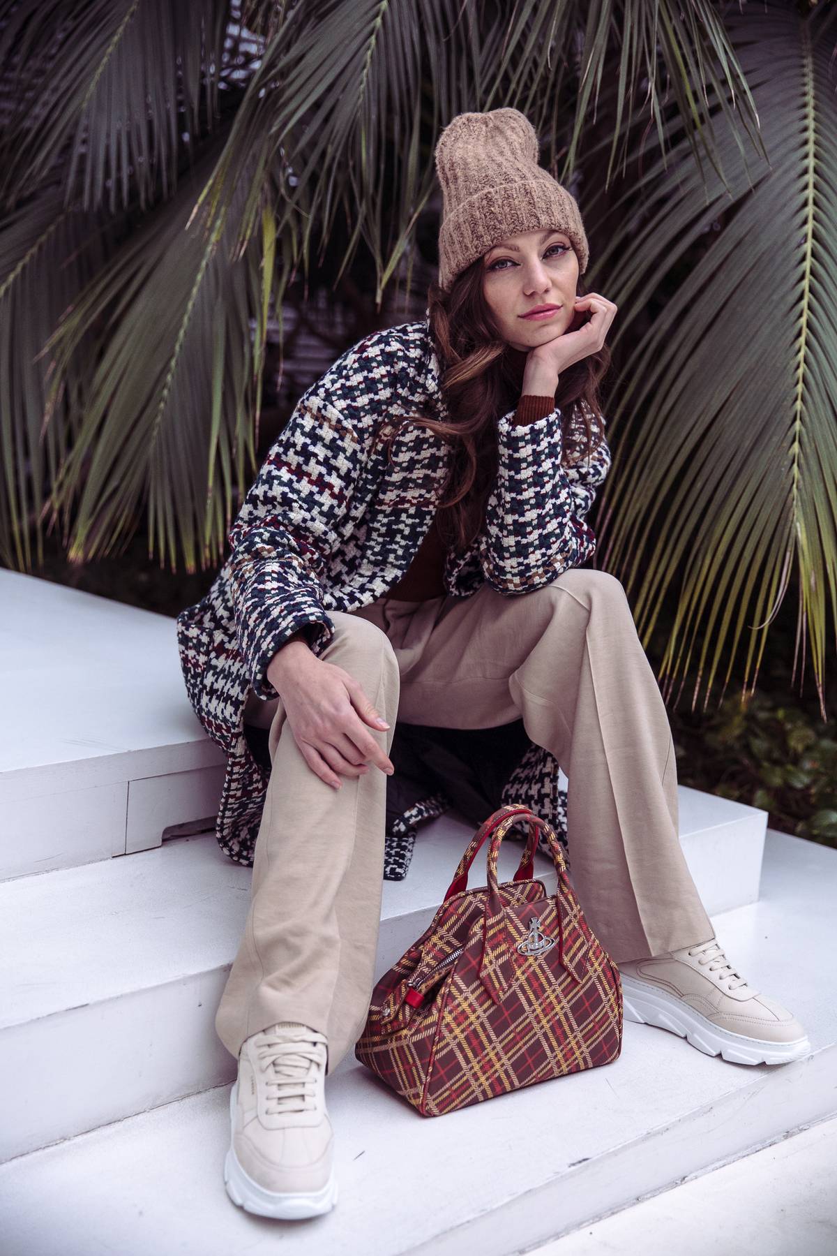 Na foto: čepice (Pieces, prodává Zalando, 310 Kč); rolák (Marks & Spencer, 299 Kč); kabát (Medicine, prodává Answear, 2199 Kč); kalhoty (Lindex, 999 Kč); kabelka (Vivienne Westwood, prodává Zalando, 11 280 Kč); tenisky (Copenhagen, prodává Zalando, 4800 Kč)