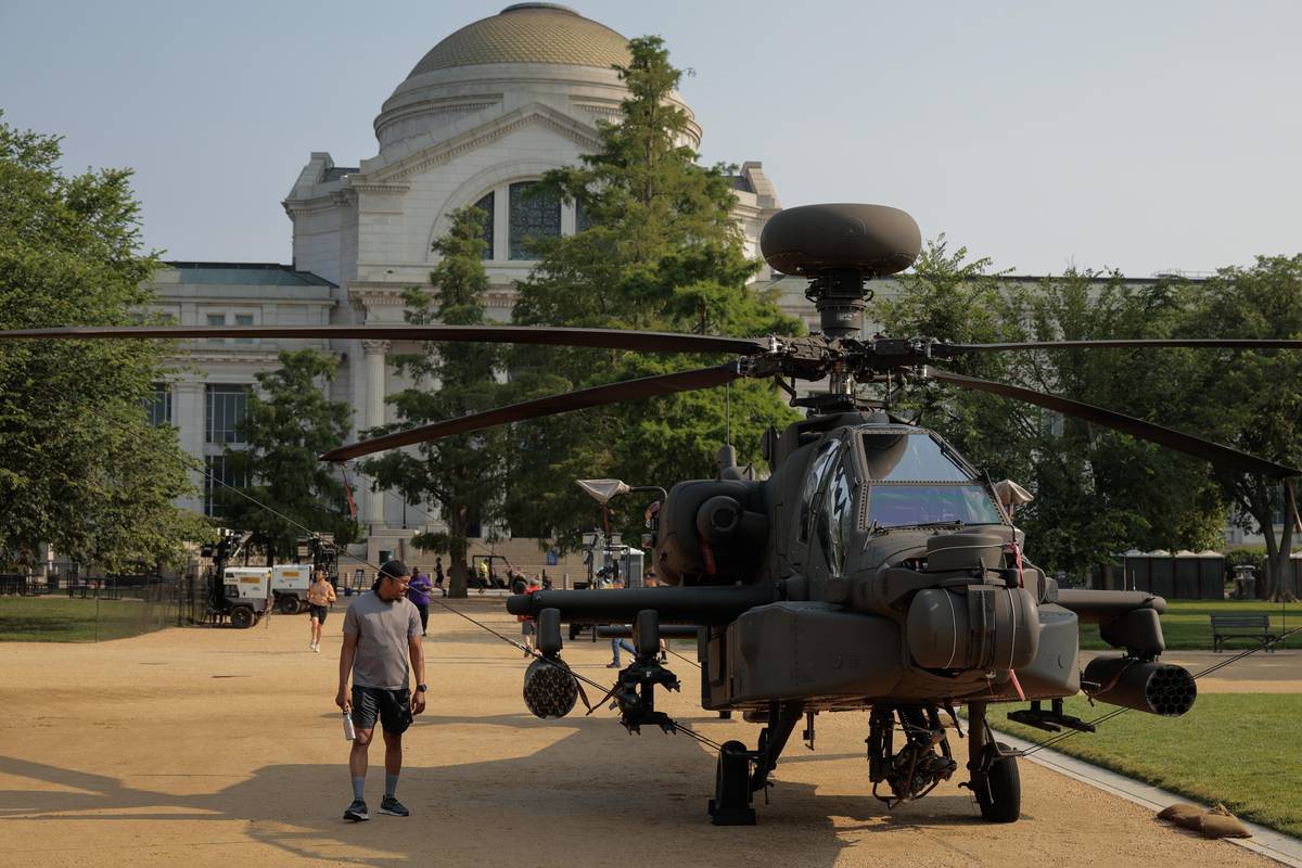 Návštěvníci si prohlížejí bitevní vrtulník AH-64 Apache americké armády, vystavený na National Mall ve Washingtonu.