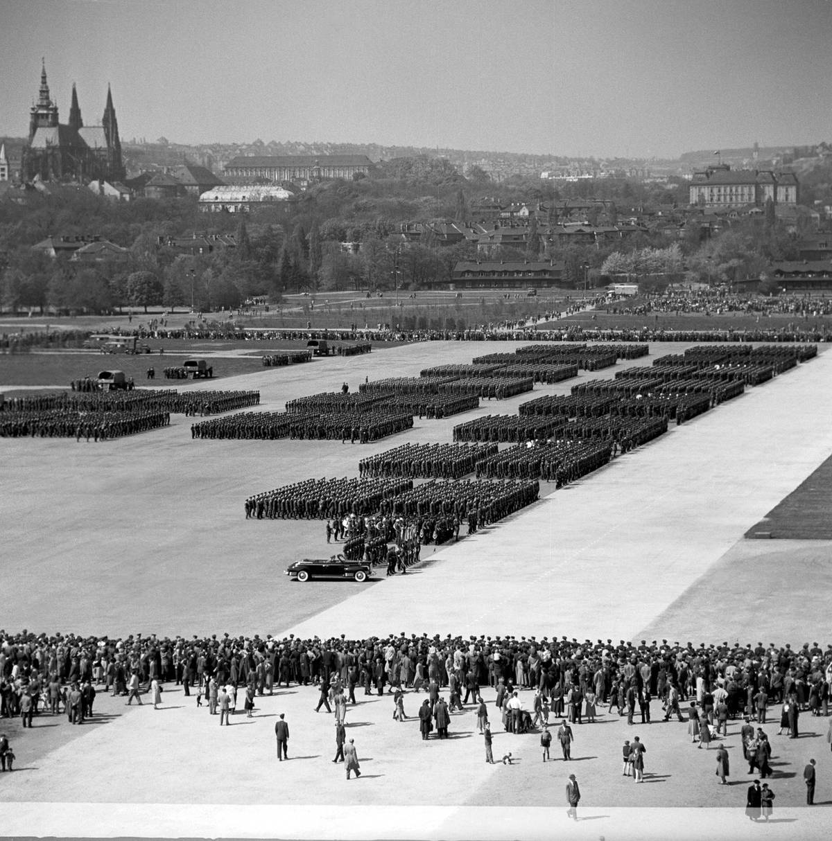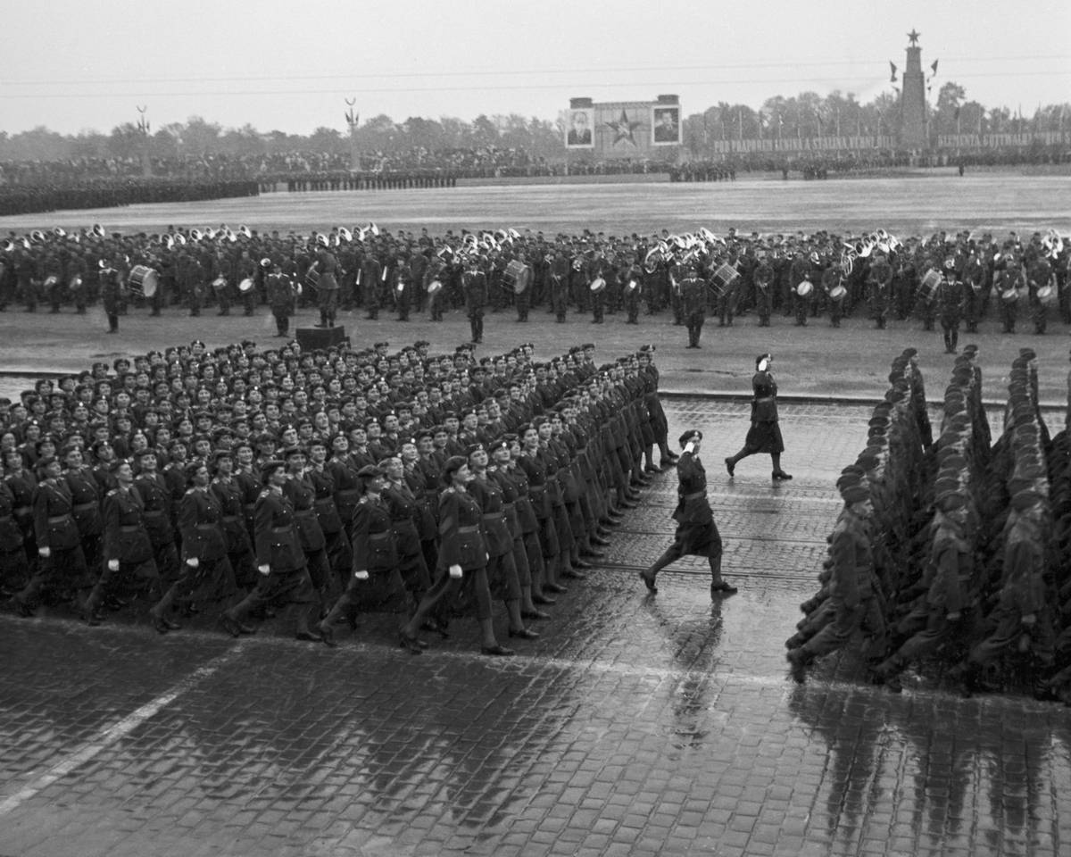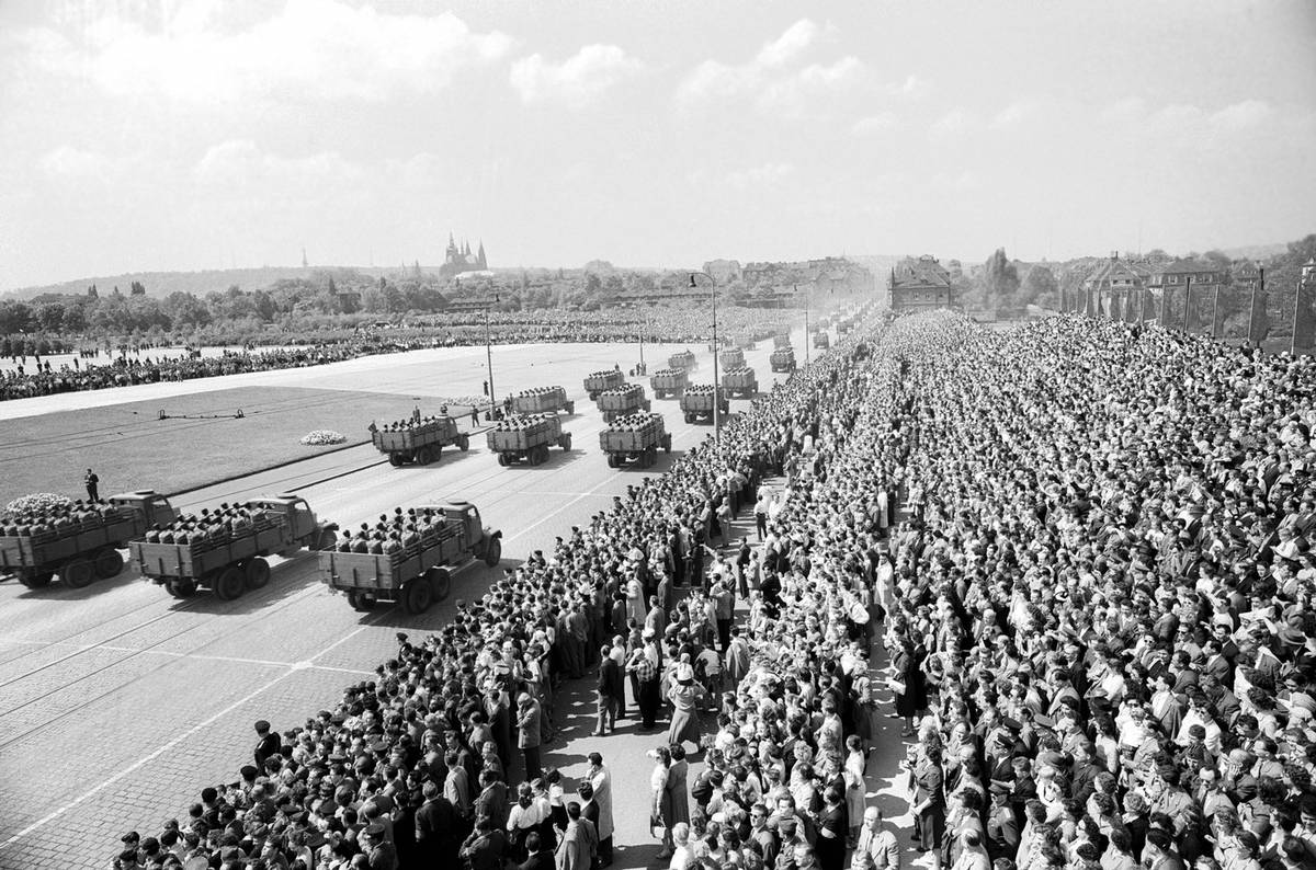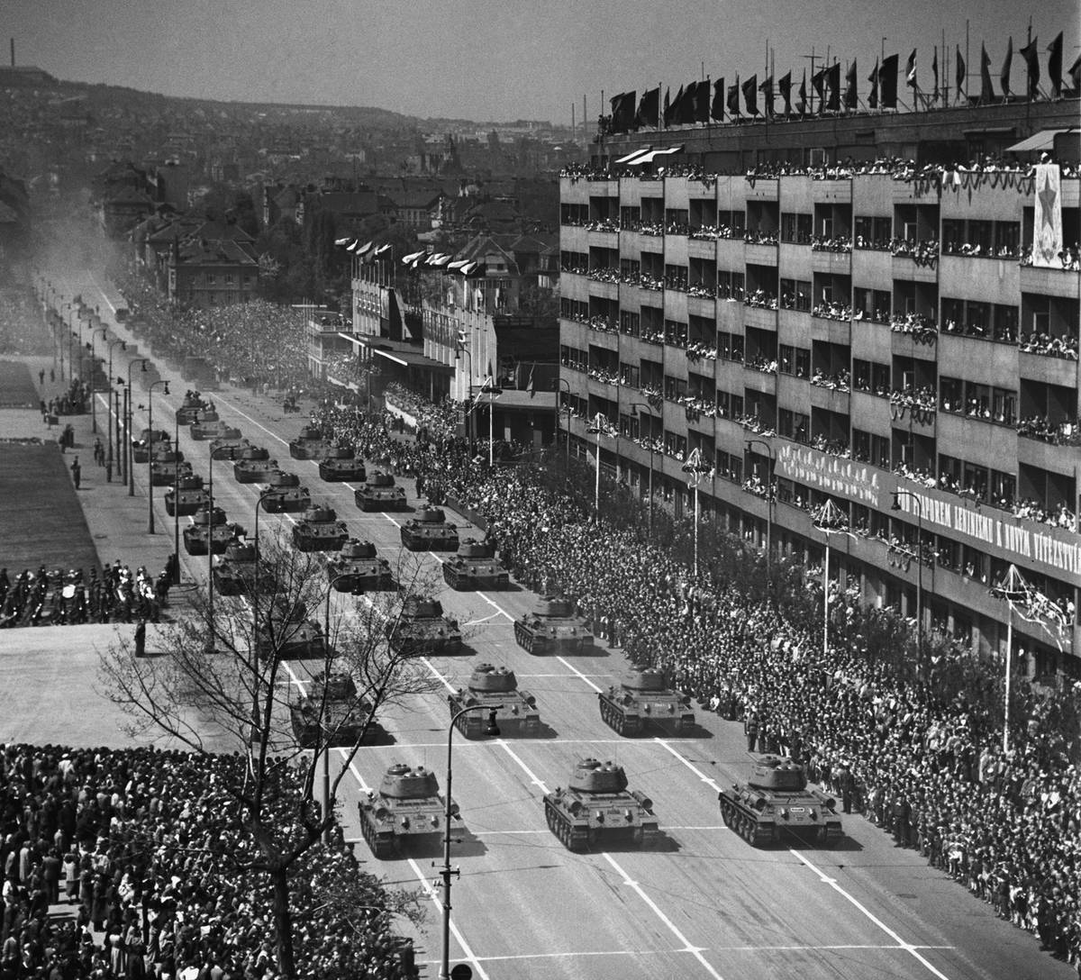 Při přehlídkách konaných u příležitosti osvobození Československa Rudou armádou se sjely do Prahy desítky tisíc vojáků z vybraných útvarů ČSLA a také stovka nejrůznější bojové techniky včetně letadel, připomínají historici. (Na snímku z roku 1956 je vidět mechanizovaná divize.)