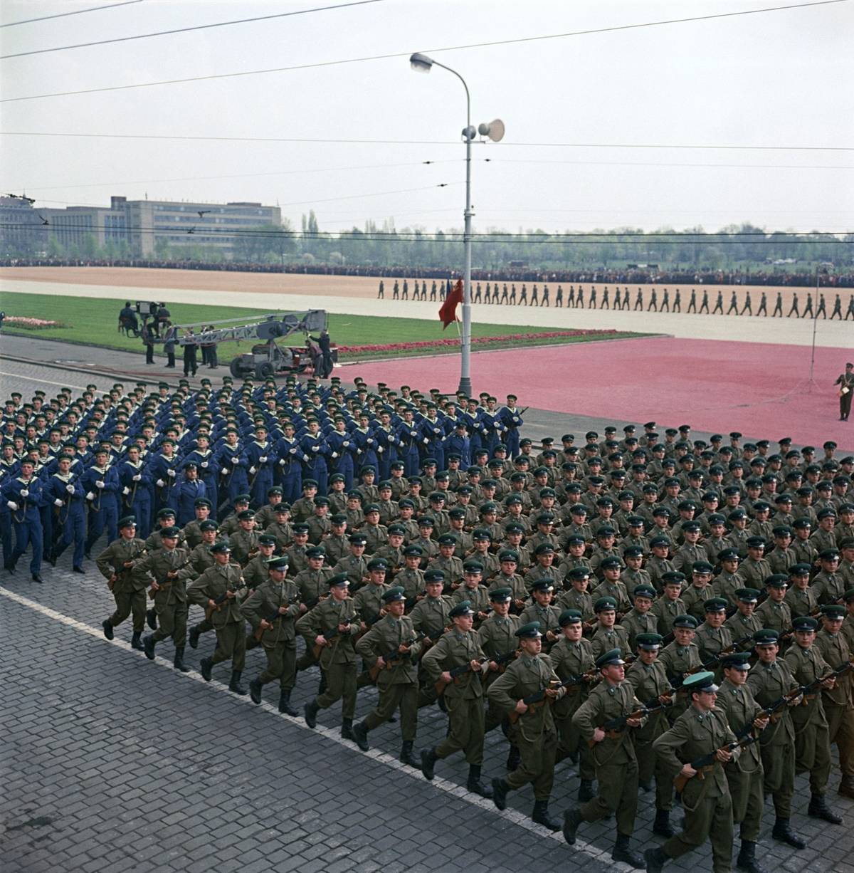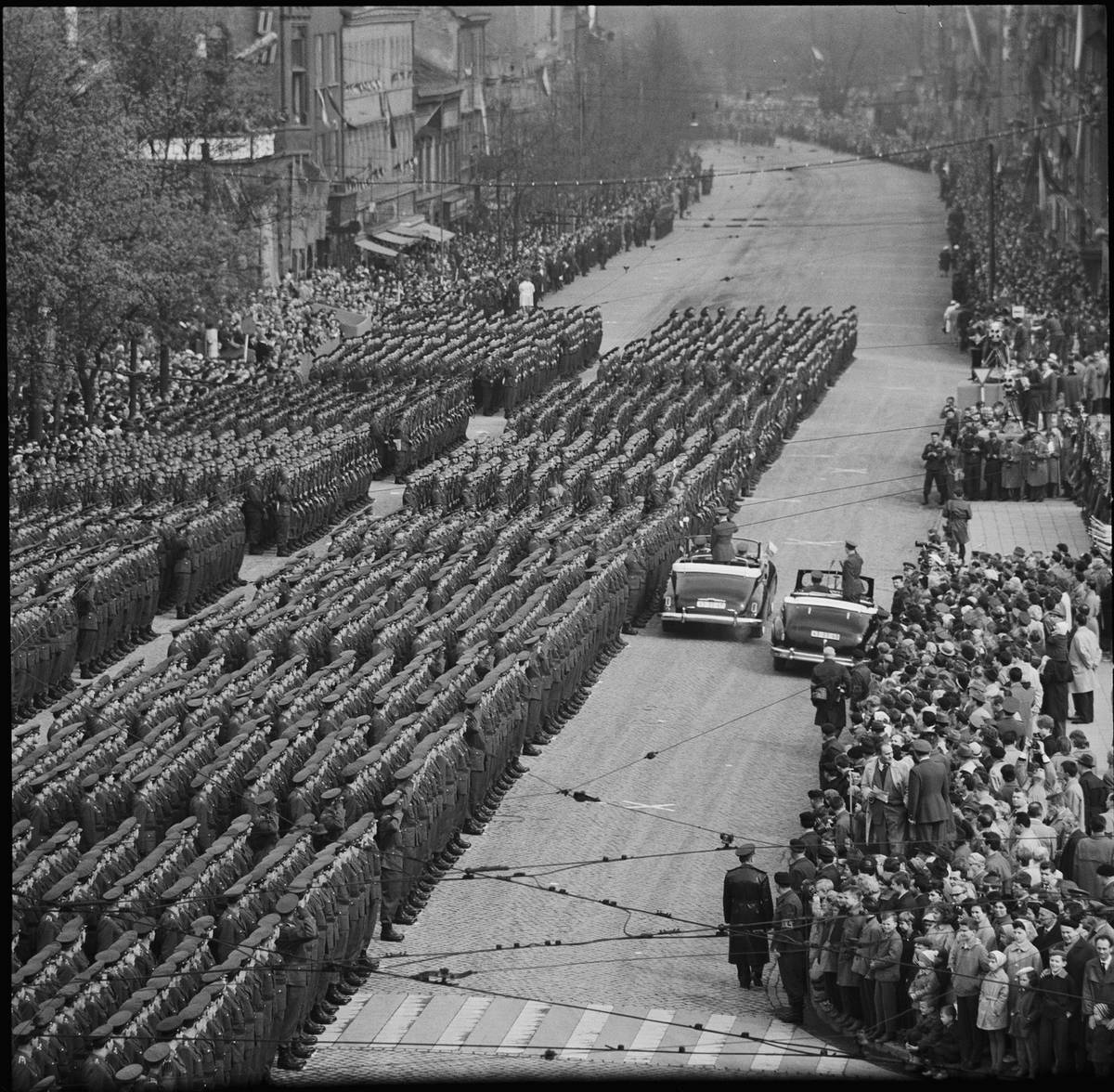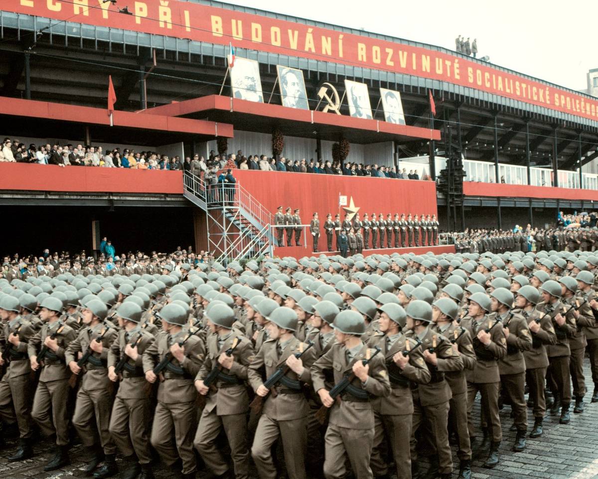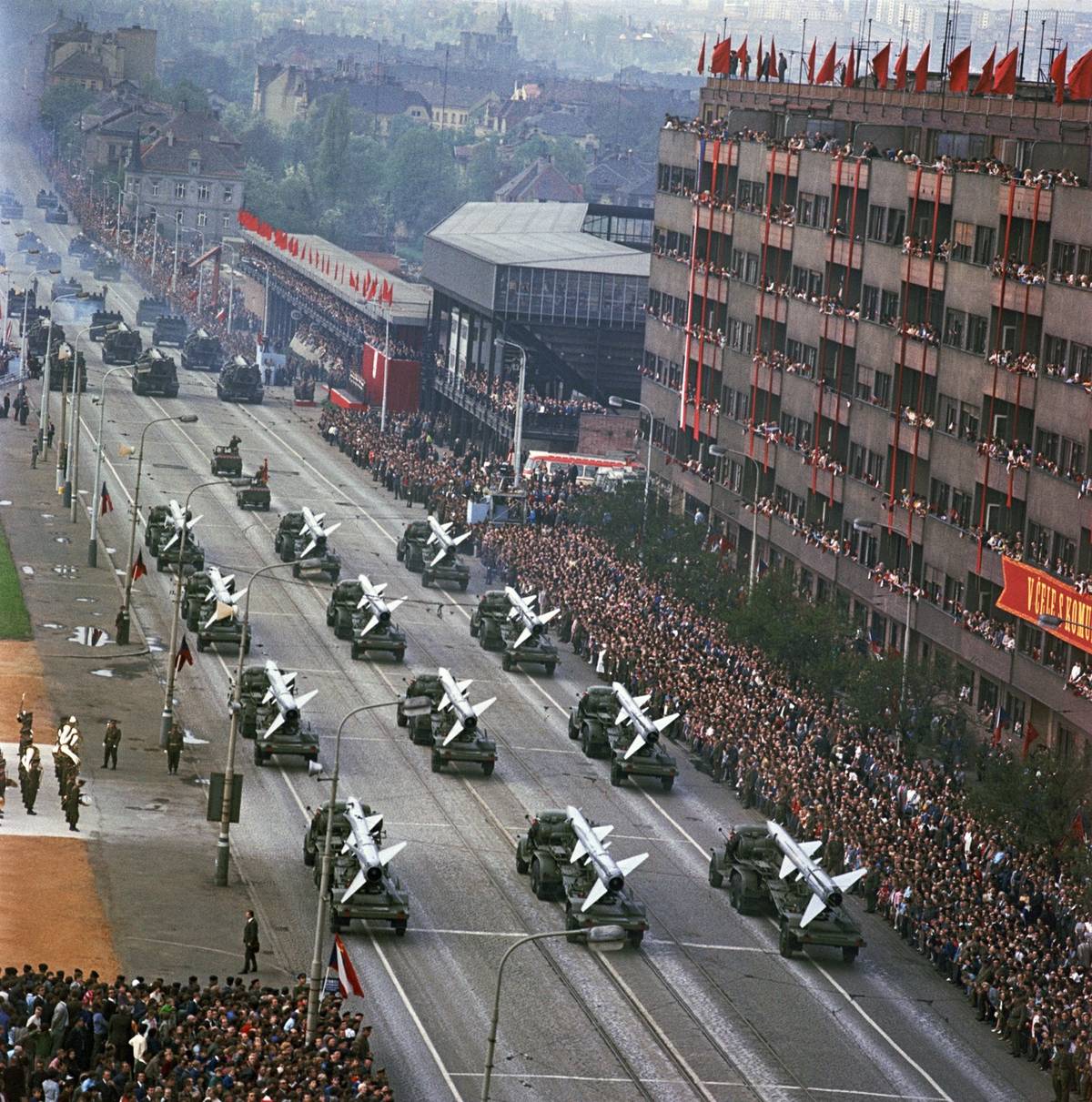 Při přehlídkách konaných u příležitosti osvobození Československa Rudou armádou se sjely do Prahy desítky tisíc vojáků z vybraných útvarů ČSLA a také stovka nejrůznější bojové techniky včetně letadel, připomínají historici. (Na snímku z roku 1956 je vidět mechanizovaná divize.)