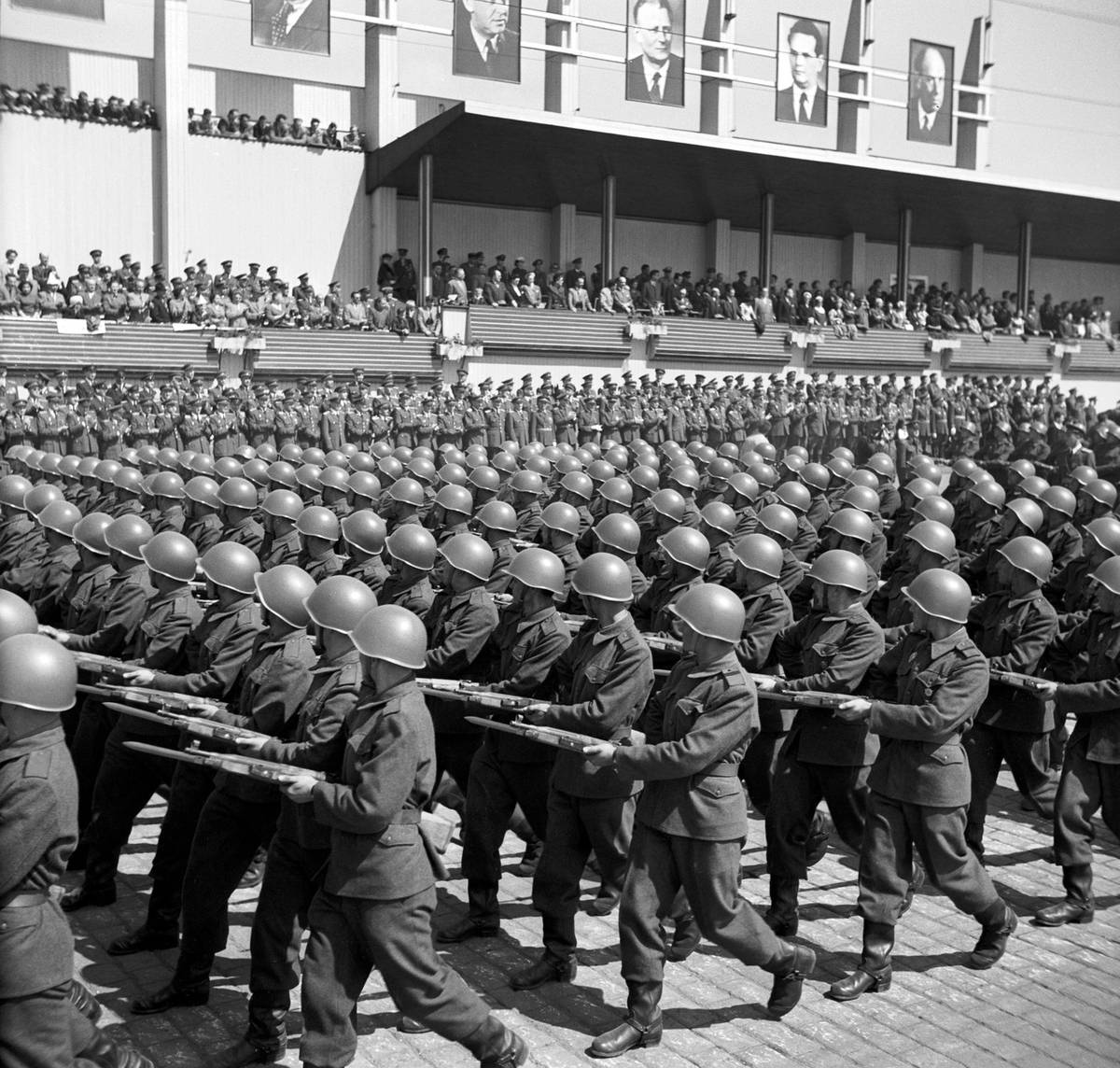 Před tribunami s představiteli komunistického režimu procházejí příslušníci 84. přehlídkové střelecké divize. (Snímek z roku 1956.)