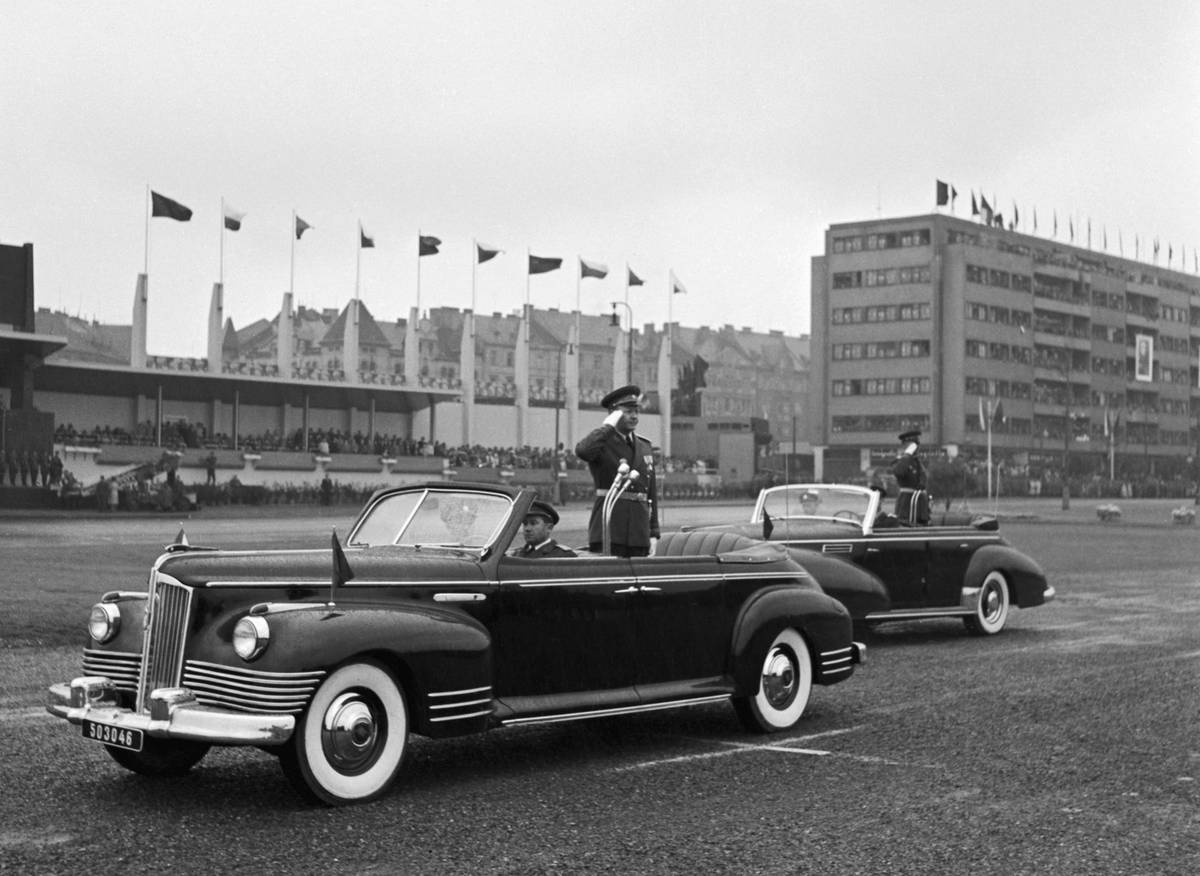 Vojenská přehlídka k osmému výročí osvobození Československa se už odehrávala podle sovětských pravidel. Ministr obrany Alexej Čepička zdraví z automobilu nastoupené oddíly. (Letenská pláň v Praze, 9. května 1953)