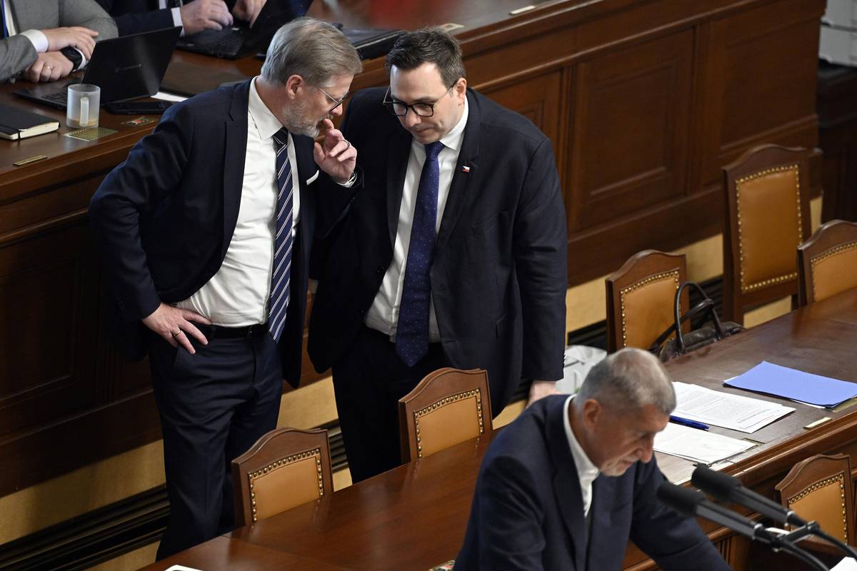Premiér Petr Fiala (ODS) s ministrem vnitra Janem Lipavským (vpravo). Pod nimi Andrej Babiš (ANO).