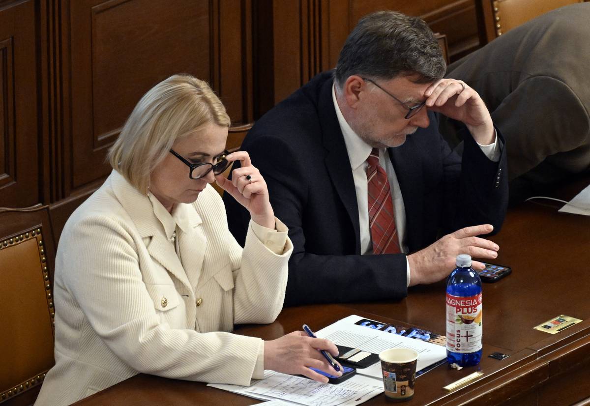 Ministryně obrany Jana Černochová a ministr financi Zbyněk Stanjura (oba ODS) na mimořádné schůzi Sněmovny.