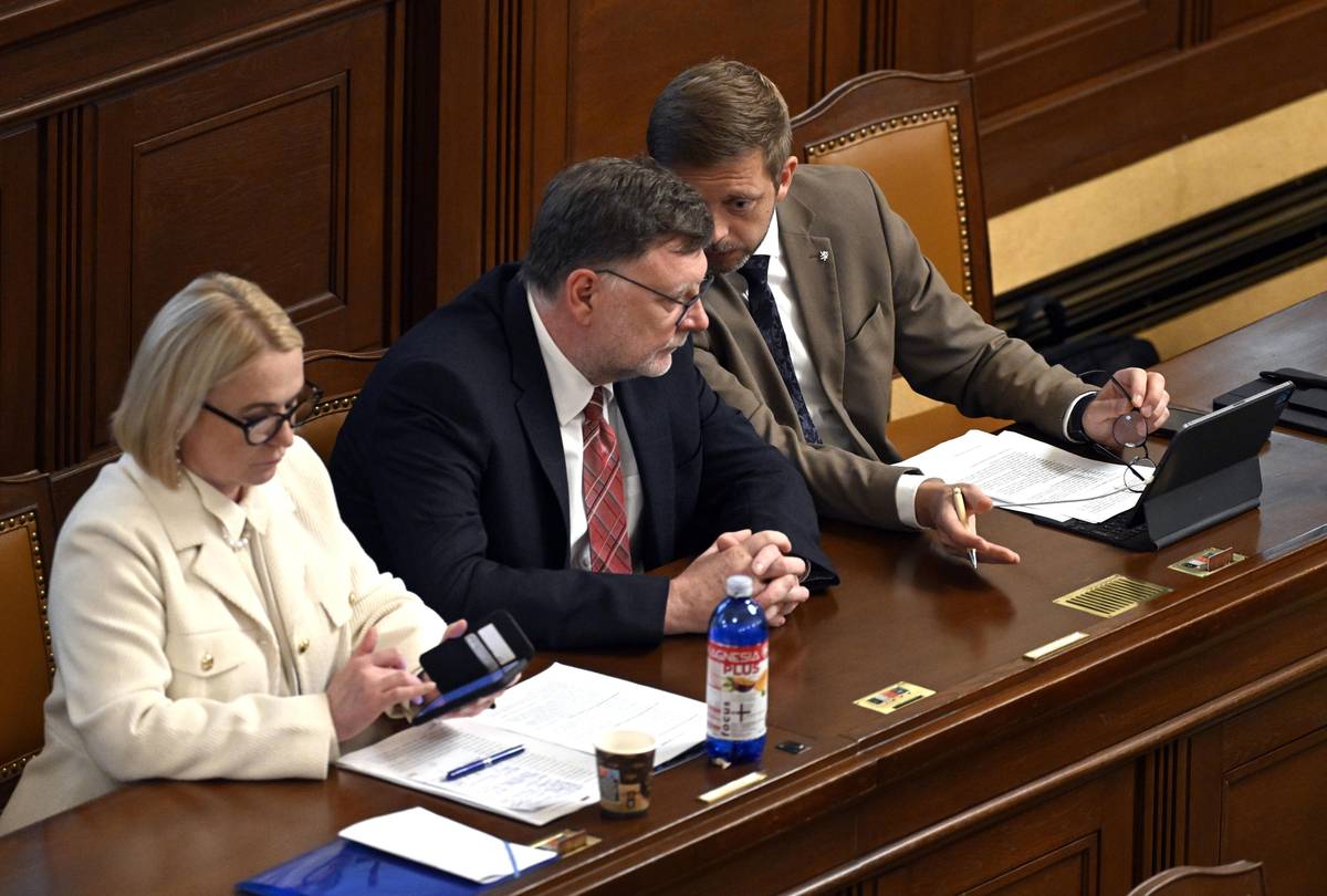 Ministryně obrany Jana Černochová, ministr financi Zbyněk Stanjura (oba ODS) a ministr vnitra Vít Rakušan (STAN) na mimořádné schůzi Sněmovny.