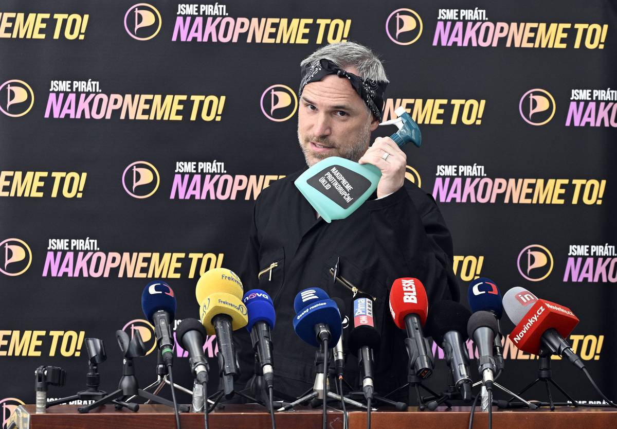 Předseda Pirátů Zdeněk Hřib na tiskové konferenci v Poslanecké sněmovně převlečený za uklízečku. Piráti se ve speciálních oblecích prezentovali jako „protikorupční čističi“