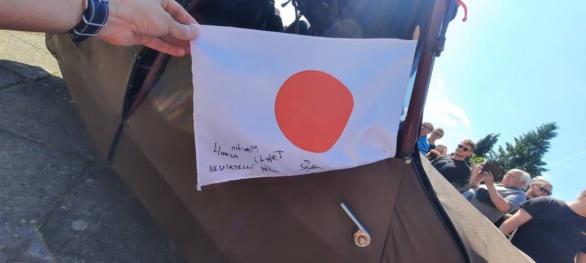 Cíl své cesty vyvěsili dobrodruzi formou vlajky na jednom ze strojů.