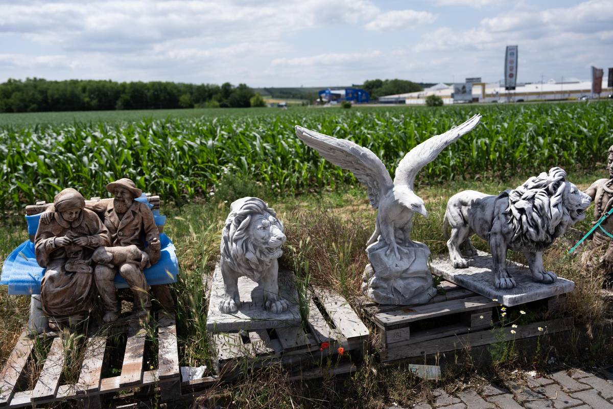 Výstava soch u pole s kukuřicí.