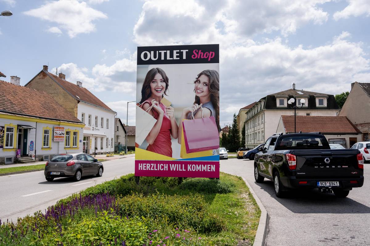 Příjezd do města zdobí reklama na obchod.