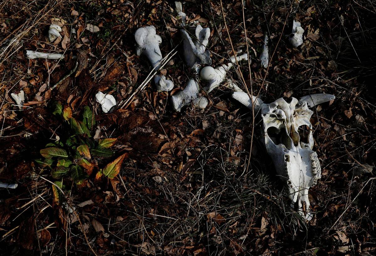Okolo kříže jsou úmyslně ponechané ostatky uhynulých zvířat.