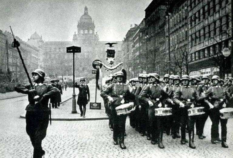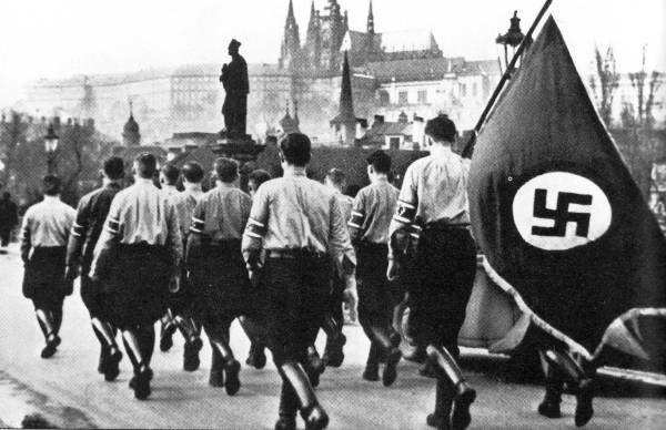 Češi se zlobili, plakali, nadávali, Němci žijící v Praze jásali. Němečtí studenti 15. března oblékli uniformy a vyrazili na Hrad, aby zde přivítali Adolfa Hitlera.