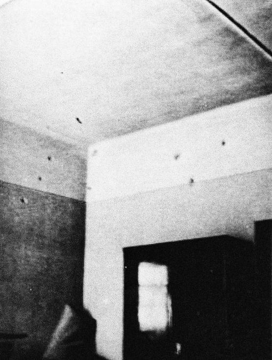 Ale i tak, alespoň co do počtu utržených ztrát, pomyslně zvítězila česká vojenská posádka. Její palba v podmínkách přesily cca 1 : 4 usmrtila přibližně až 18 německých vojáků a zranila okolo šedesáti. Na snímku: Autentický záběr na stopy německých střel v interiéru Czajánkových kasáren.