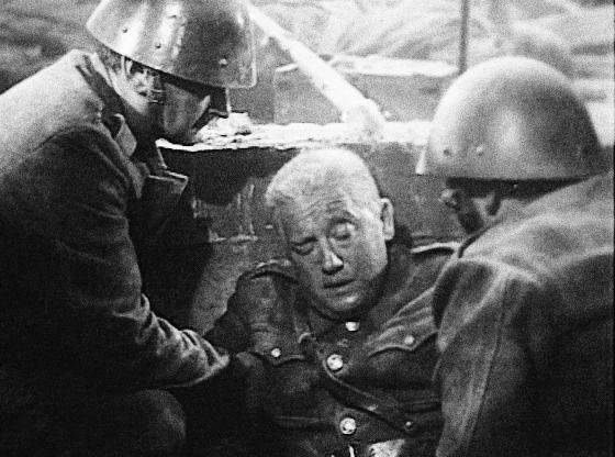 Dobře organizovaná a vedená kulometná palba české jednotky kapitána Karla Pavlíka držela dlouho Němce přikované k zemi. Na snímku: Filmová fikce. Záběr z filmu „Neporažení“ z roku 1956 v režii Jiřího Sequense.