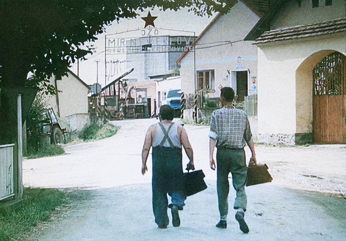 Menší ramenatý muž pohupuje v ruce odřenou aktovkou, v níž je asi termoska a dva něčím slepené krajíce chleba. Hubený dlouhán napodobuje jeho krok. Slavný film Vesničko má středisková (1985) podle Svěrákova scénáře natočil Jiří Menzel.