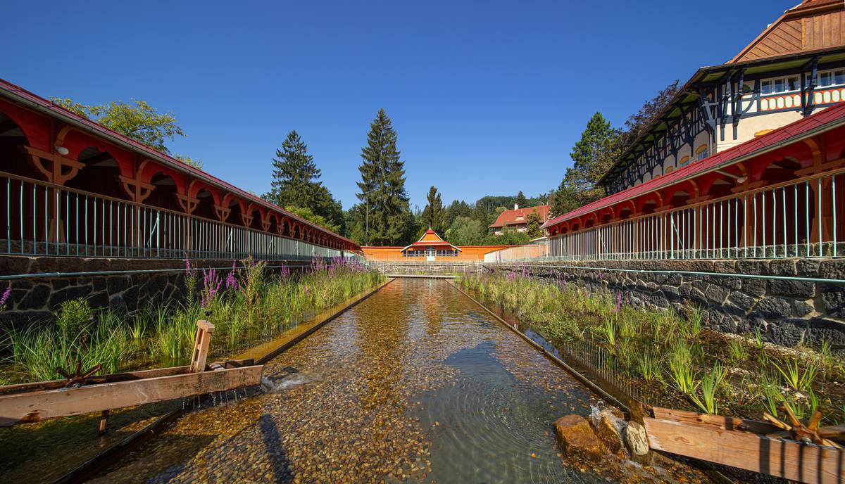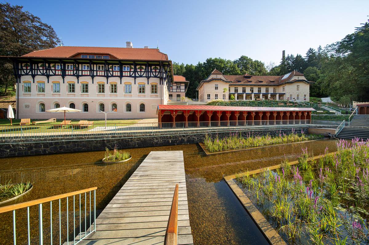 Původní Jurkovičova plovárna se změnila v okrasný biotop přístupný lázeňským hostům.