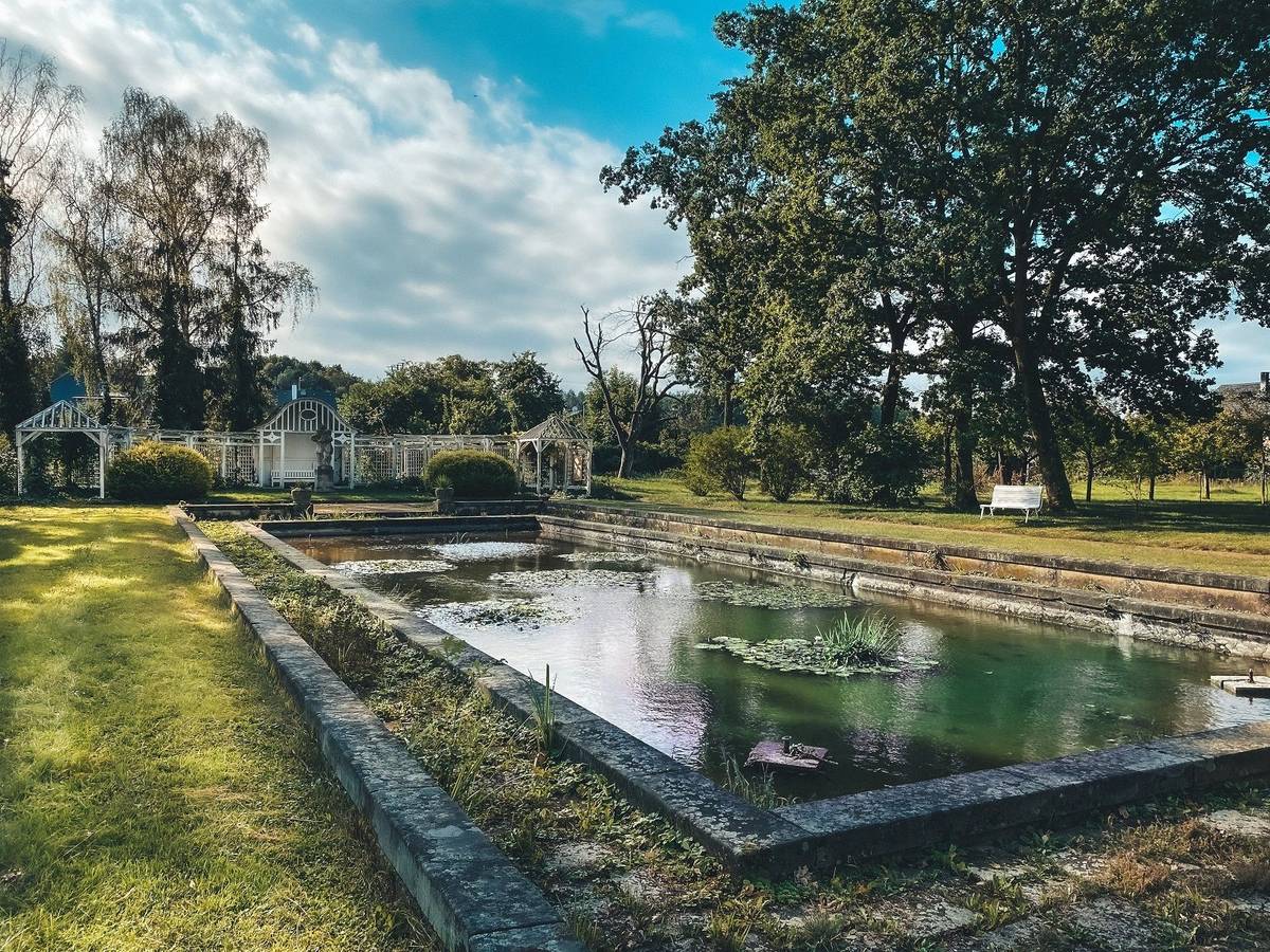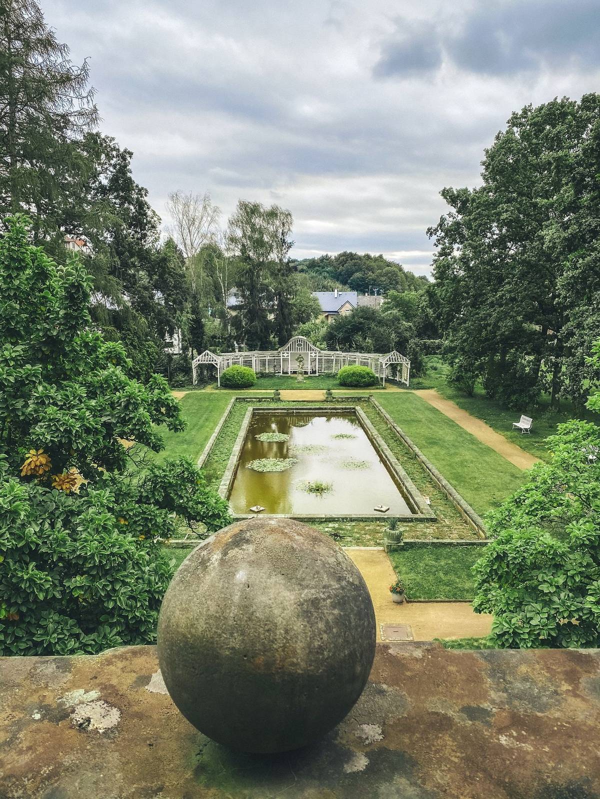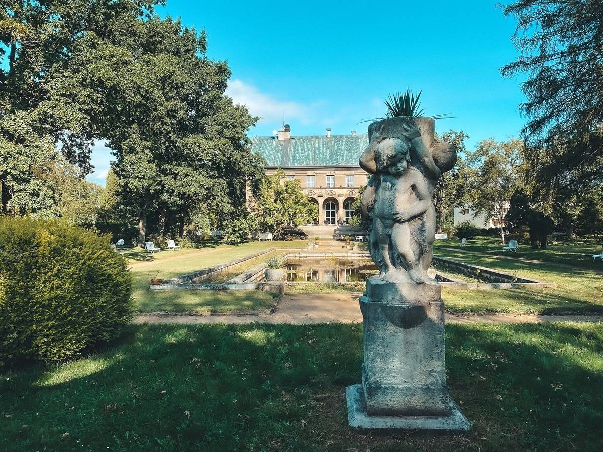 Prostor je bohatě členěný a ve vzdálenějších koutech přechází do parku v anglickém stylu. Jeho součástí jsou sochy, altány, lavičky, vzrostlé stromy a záhony květin.