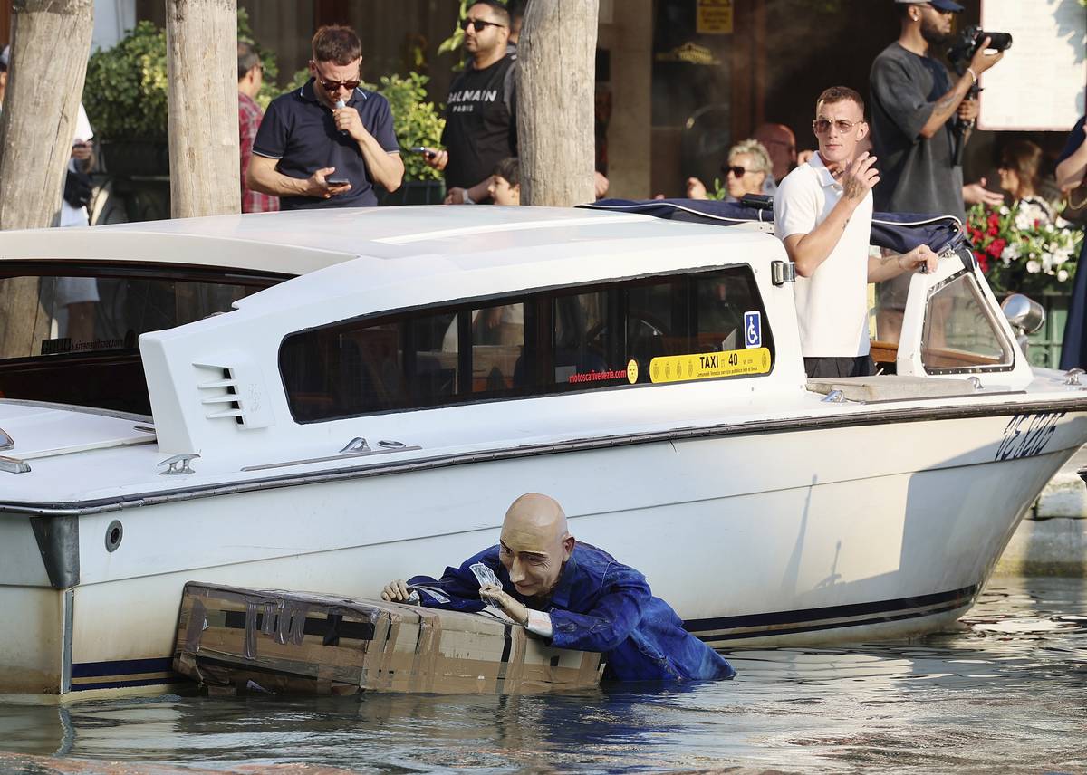 Postava připomínající Jeffa Bezose se zásilkou plující na jednom z kanálů v Benátkách. Bezos je zakladatelem internetového obchodu Amazon.