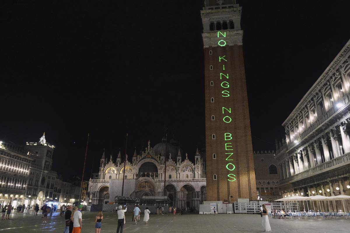 Na náměstí svatého Marka nechali protestující aktivisté promítnout nápis „Žádní králové, žádný Bezos.“