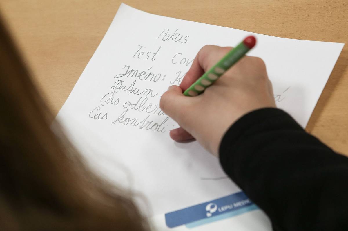 Nejdříve děti napsaly na papír jméno, datum a čas odběru. Poté, co provedly odběr z nosu, pak připočetly patnáct minut. Po uplynutí této doby se jim ukázal výsledek. Ve třetí třídě, kterou navštívila redakce Aktuálně.cz, byli všichni negativní. "A ne, že budete negativní celý den," vtipkovala s žáky jejich učitelka.