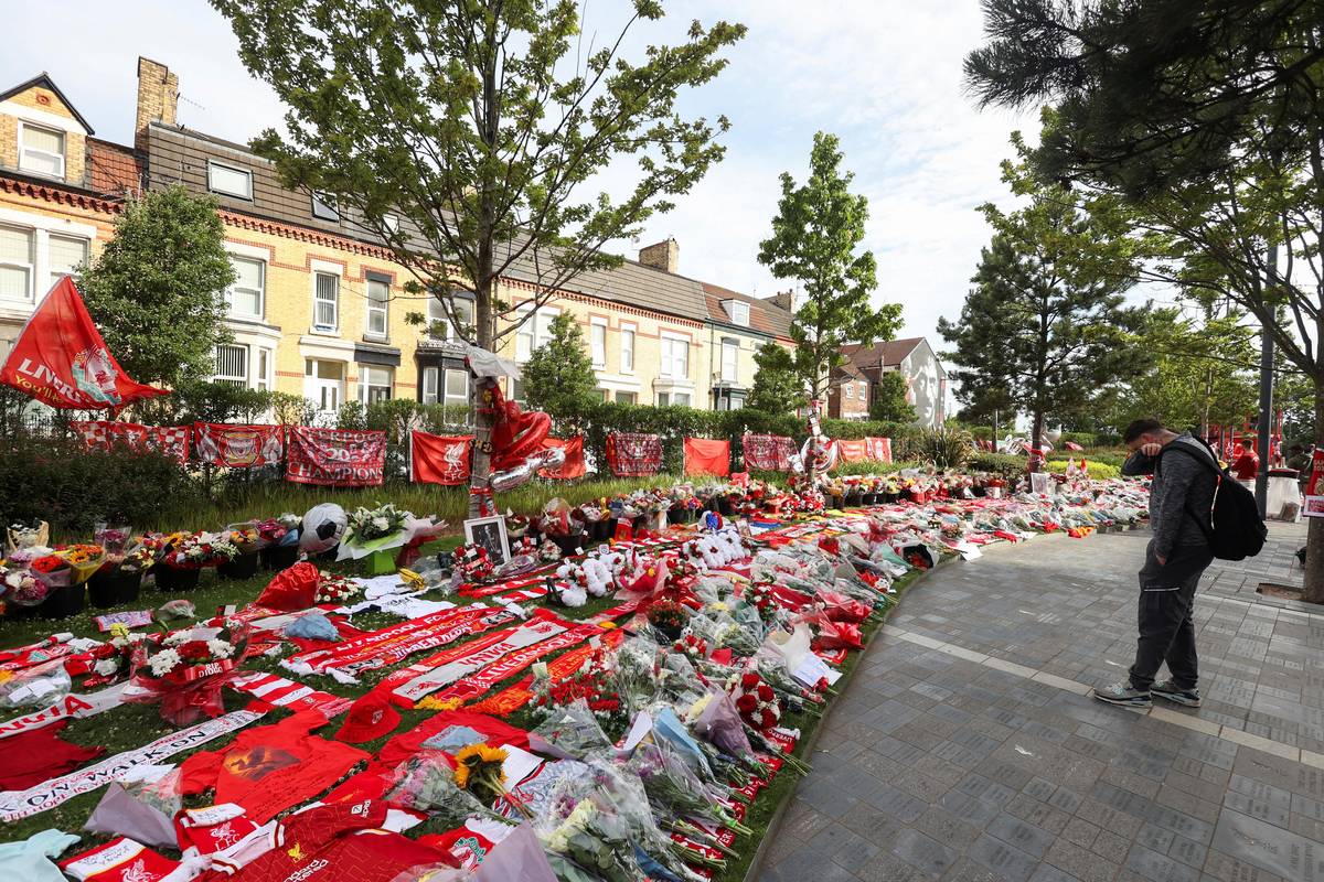Pietní místo po úmrtí Dioga Joty před stadionem Liverpoolu.