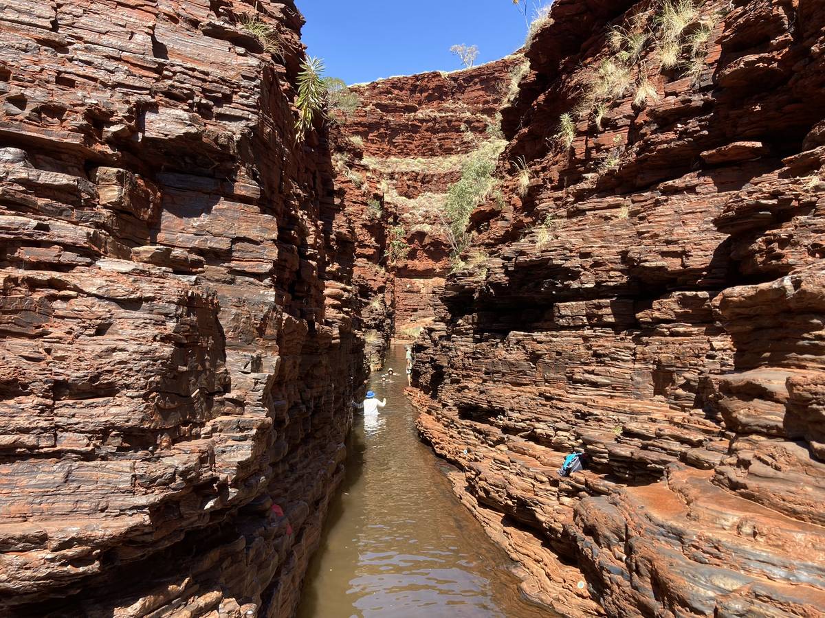 Při jednom z treků v národním parku Karijini je nutné brodit se vodou v kaňonu.