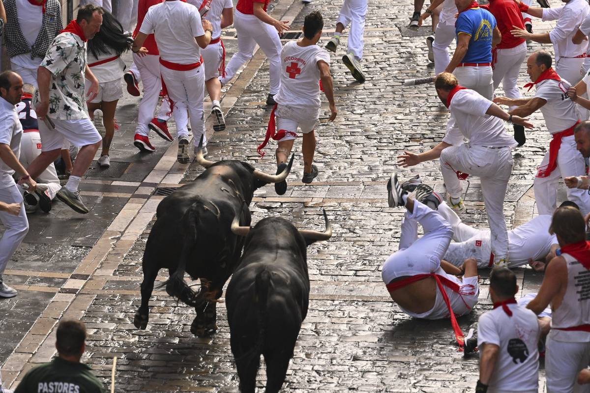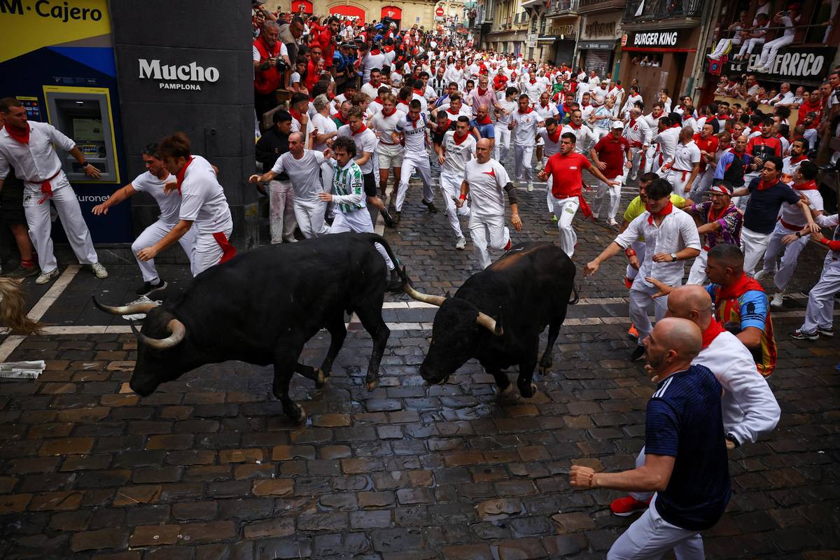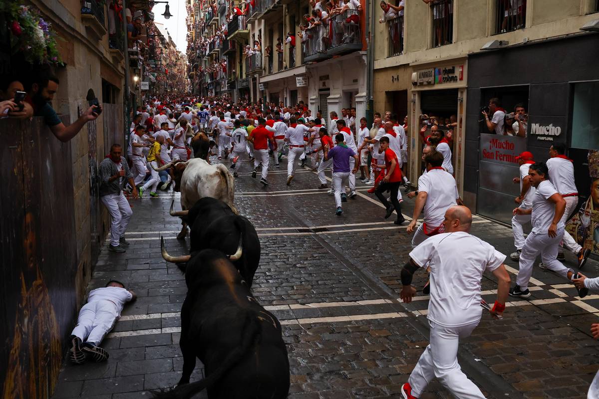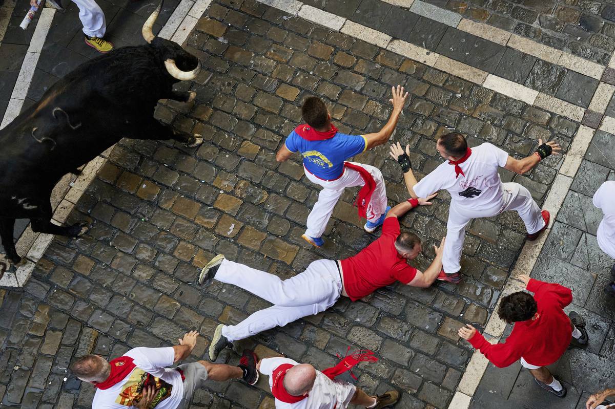 Každé ráno je do ulic Pamplony vypuštěno šest býků, kteří doběhnou až do arény. Účastníci festivalu před nimi utíkají.