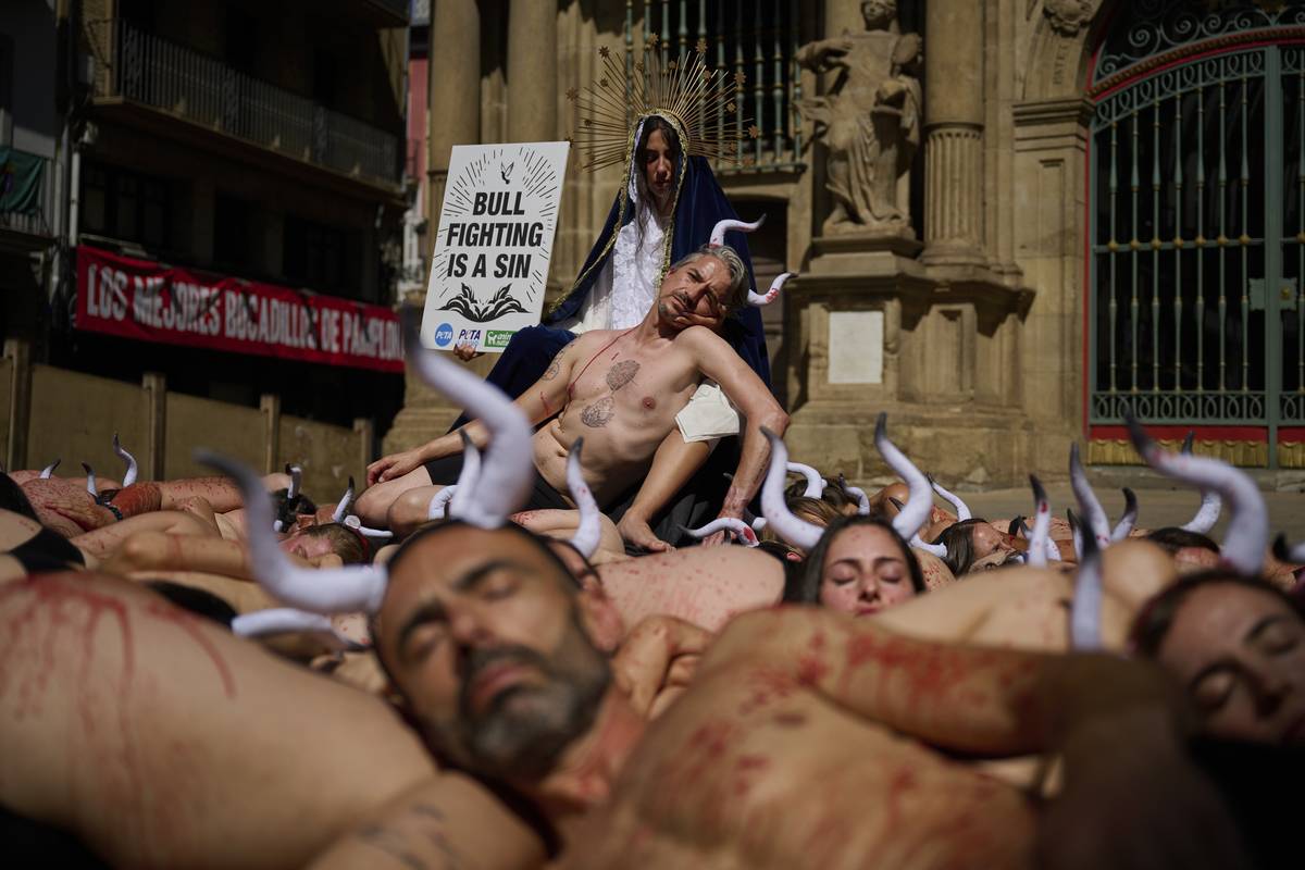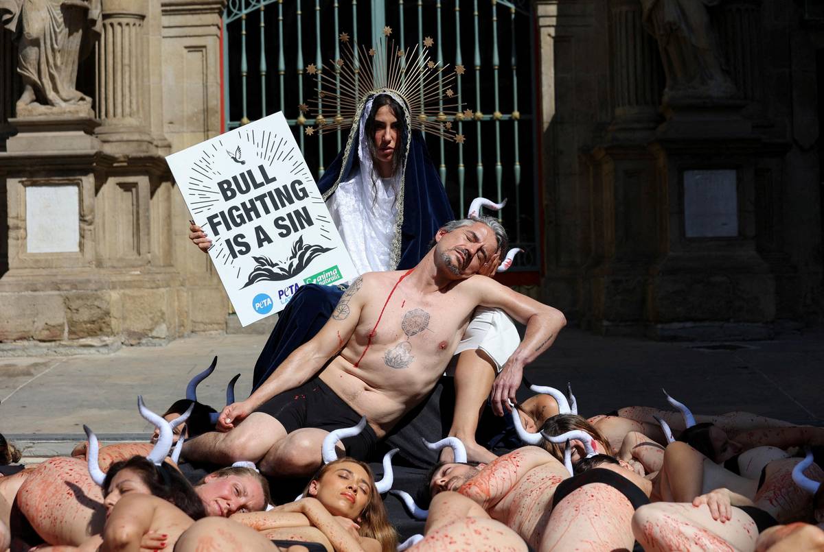 Běhy s býky a býčí zápasy sice mají dlouhou tradici, ale také hodně odpůrců. V centru Pamplony se před festivalem sešli aktivisté, aby protestovali proti zabíjení býků.