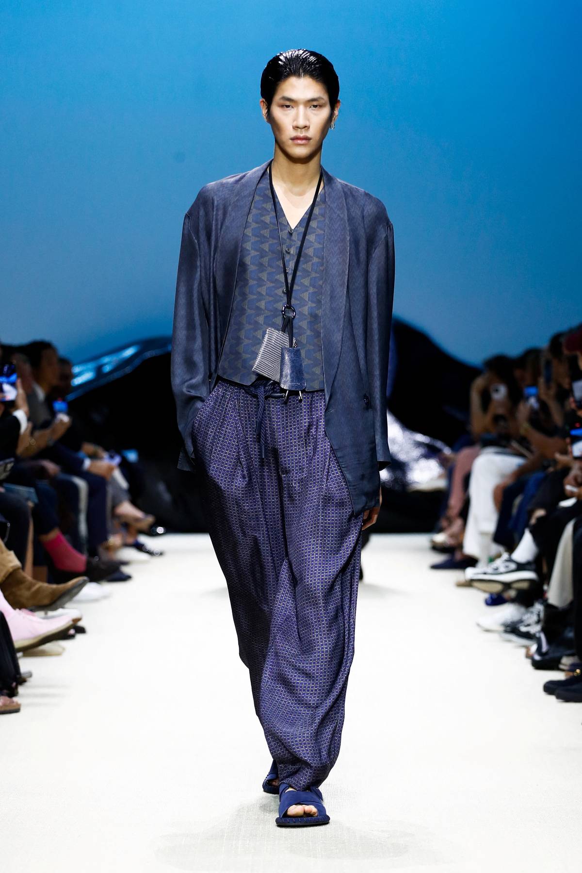 Značka Emporio Armani pracovala v outfitech rovněž s lesklými materiály.