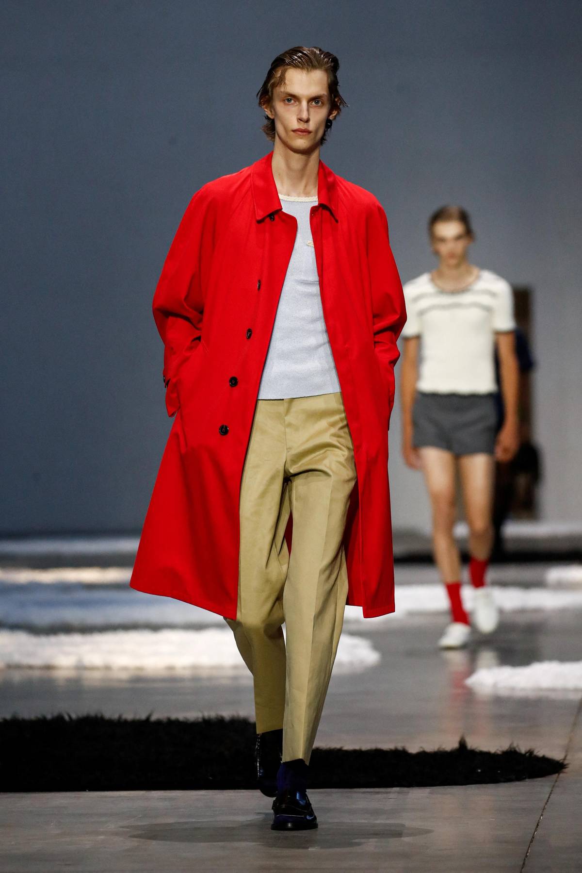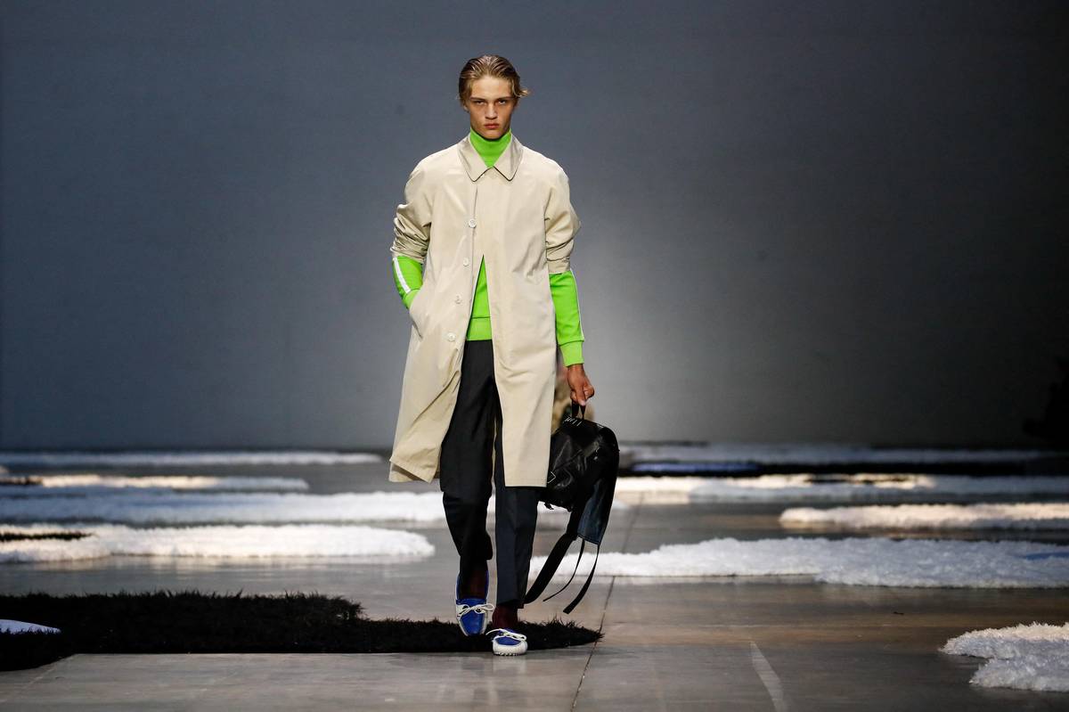 Podle značky Prada se nemusí muži bát výrazných trenčkotů.