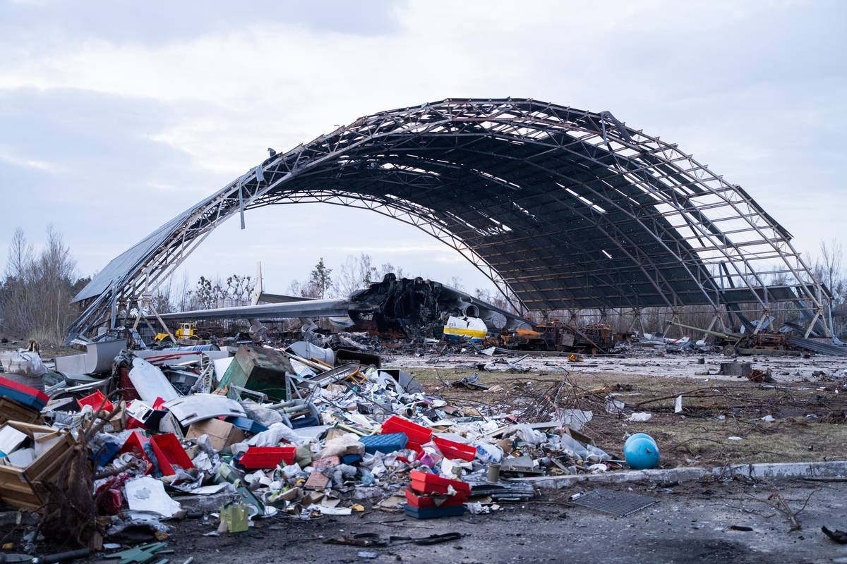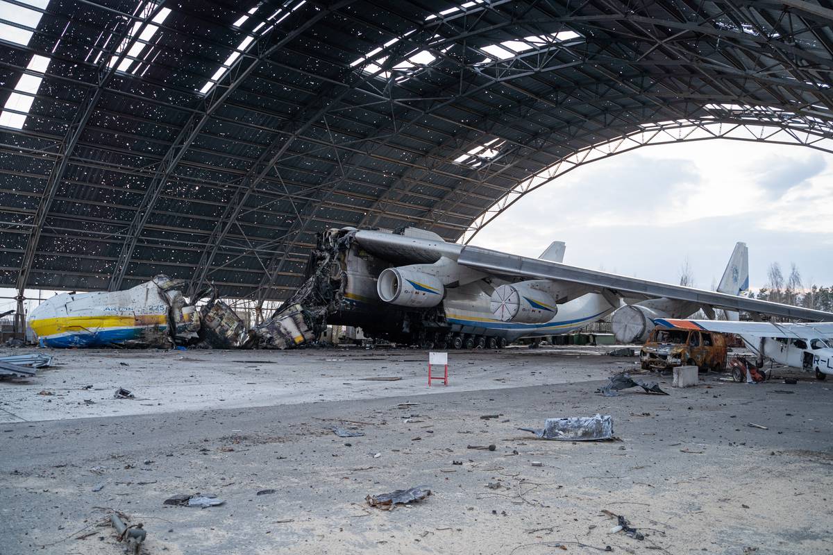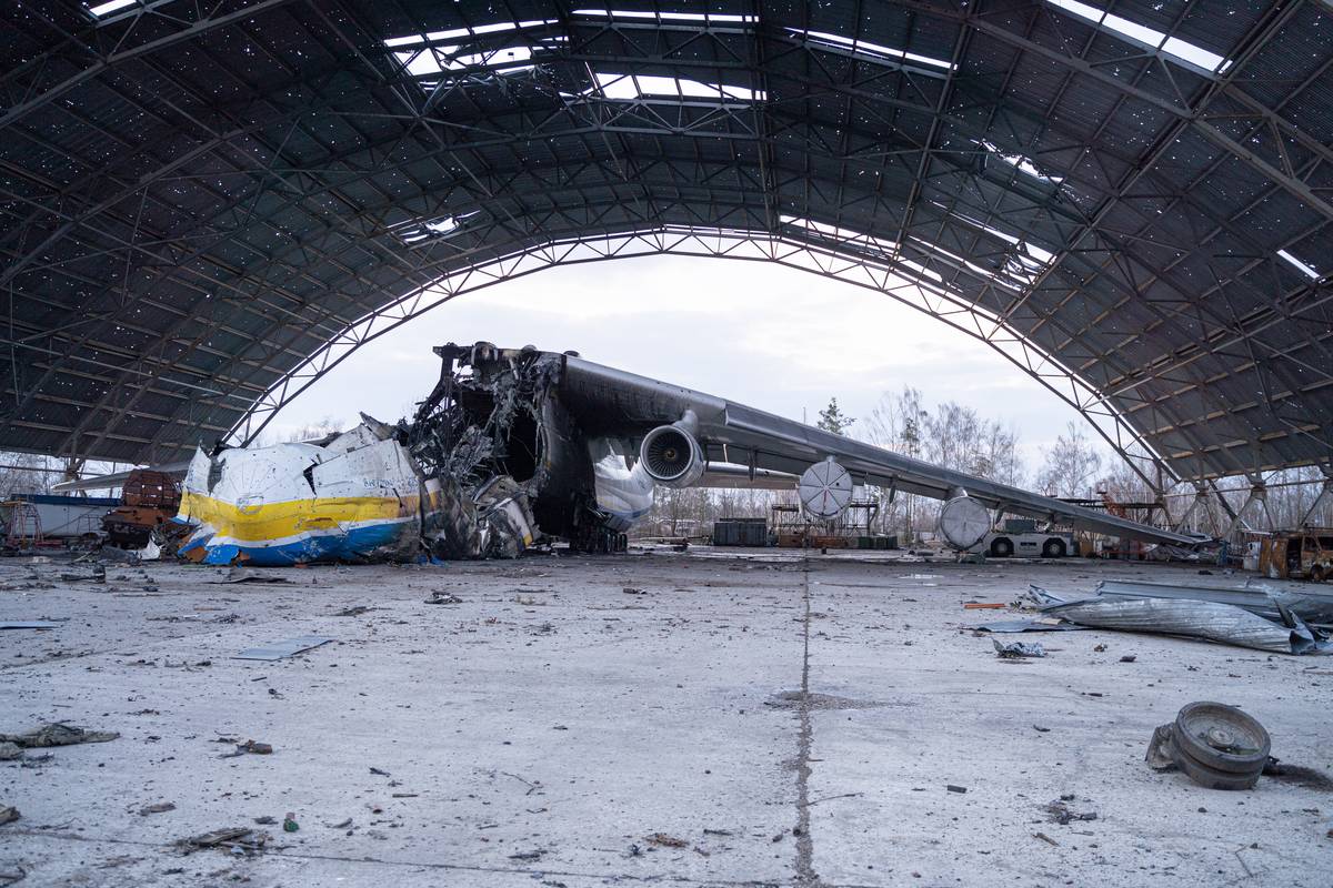 Trosky zničeného letadla Antonov An-225 Mrija. Pod vrakem Mriji jsou vidět i vraky ohořelých tanků a další obrněné techniky.