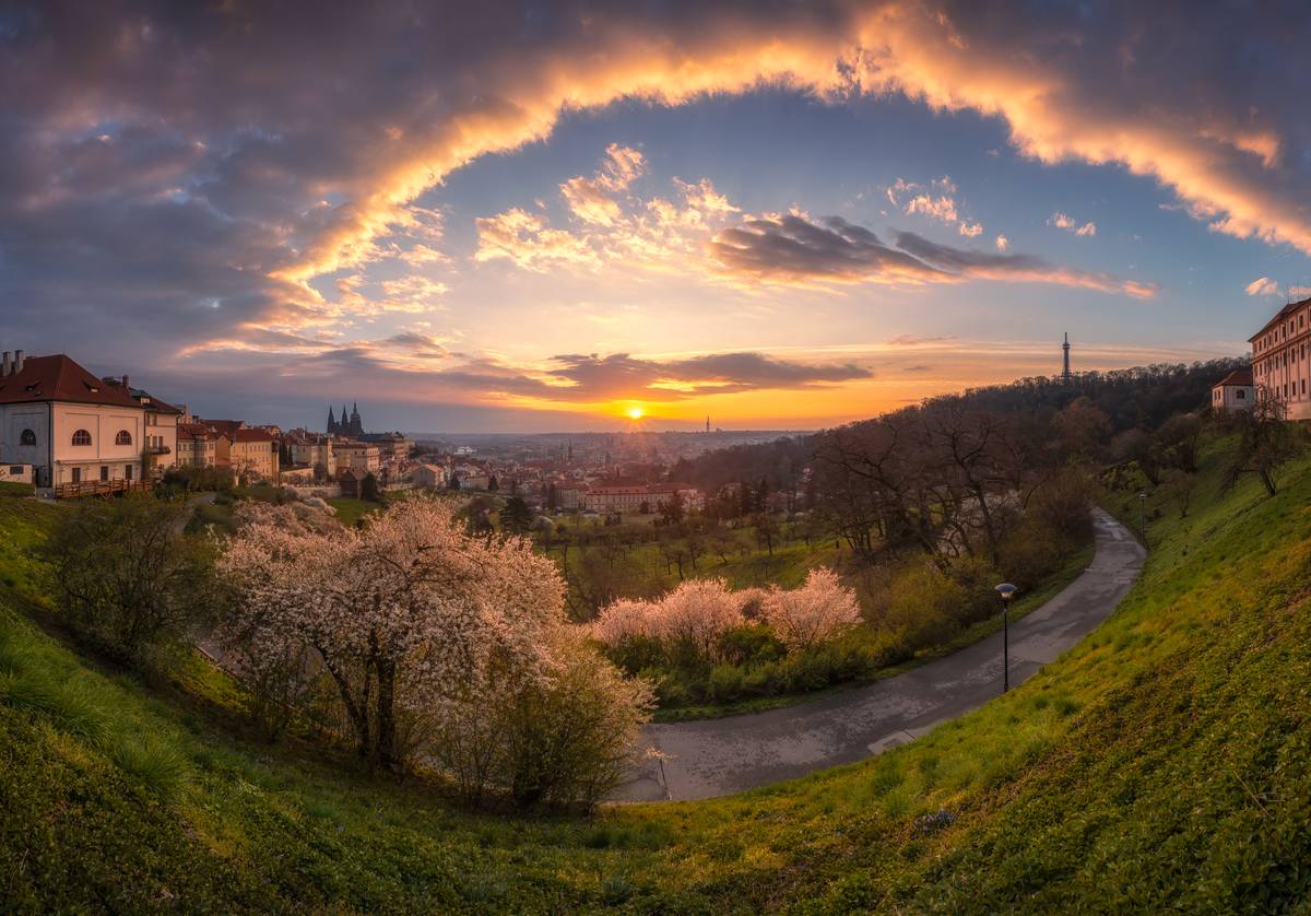 Rozkvetlý jarní Petřín v dubnu 2024. Jde o panorama složené zhruba z 25 fotek, vyfotografováno v režimu expozičního bracketingu. Valerii se snímek líbí kvůli oku, které mrak v nebi vytváří.