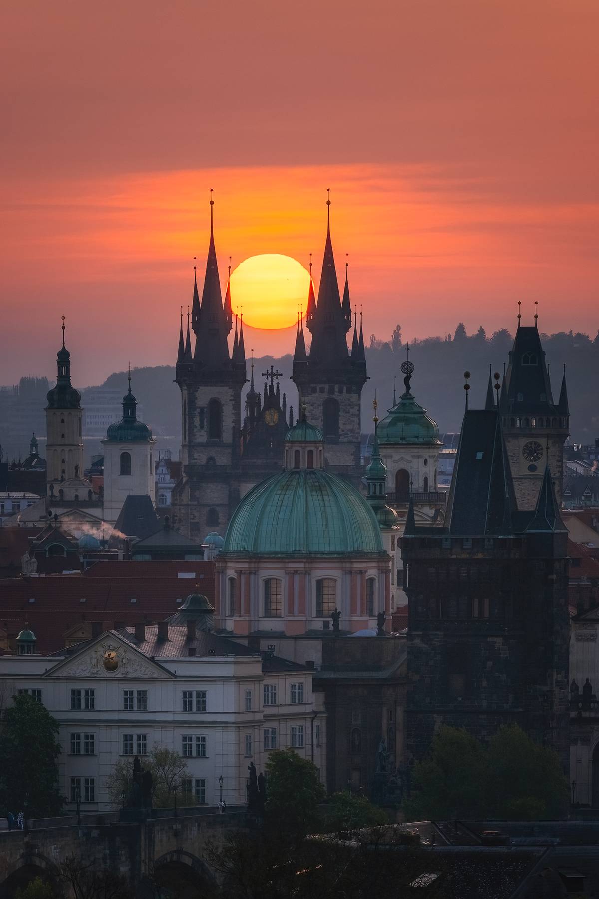 Východ slunce během doby, kdy nad Českem poletoval písek ze Sahary. Dvakrát do roka vychází slunce mezi věžemi Týnského chrámu, konkrétně v dubnu a srpnu. Snímek je zachycený z Petřína.