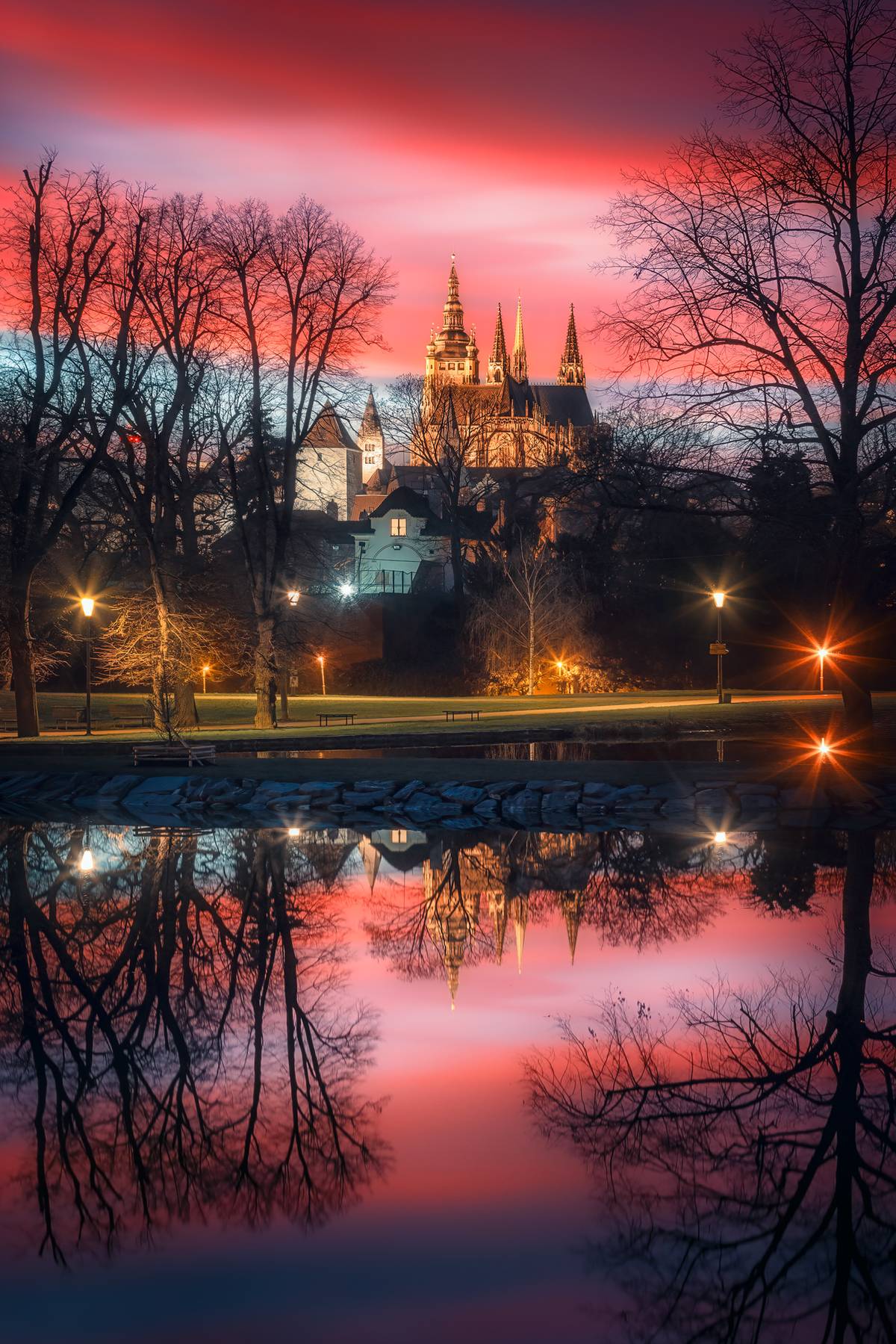 Západ slunce před Silvestrem 2024. S přítelem nejdřív jela fotit úplněk, ale za zády zahlédla, jak se vybarvuje obloha. Katedrála sv. Víta se leskne v odrazu Letenského rybníka.