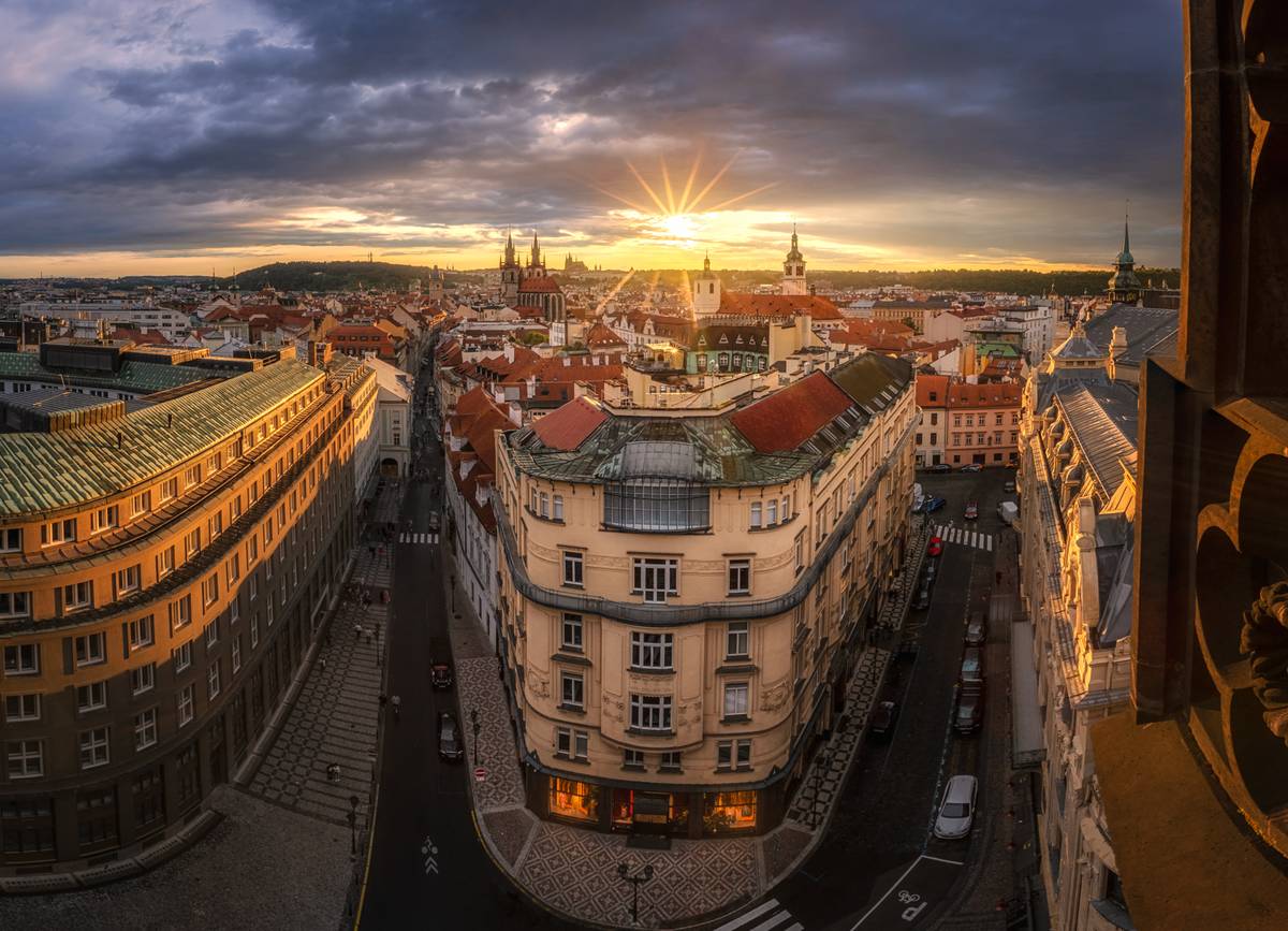 Letní večer zachycený z Prašné brány. Jde o panorama vyfocené z ruky.