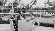 (Na snímku americký animátor a producent Walt Disney se svou ženou Lillian a dcerou Diane v točícím se šálku čaje v Disneylandu krátce po jeho otevření v Anaheimu v Kalifornii.)