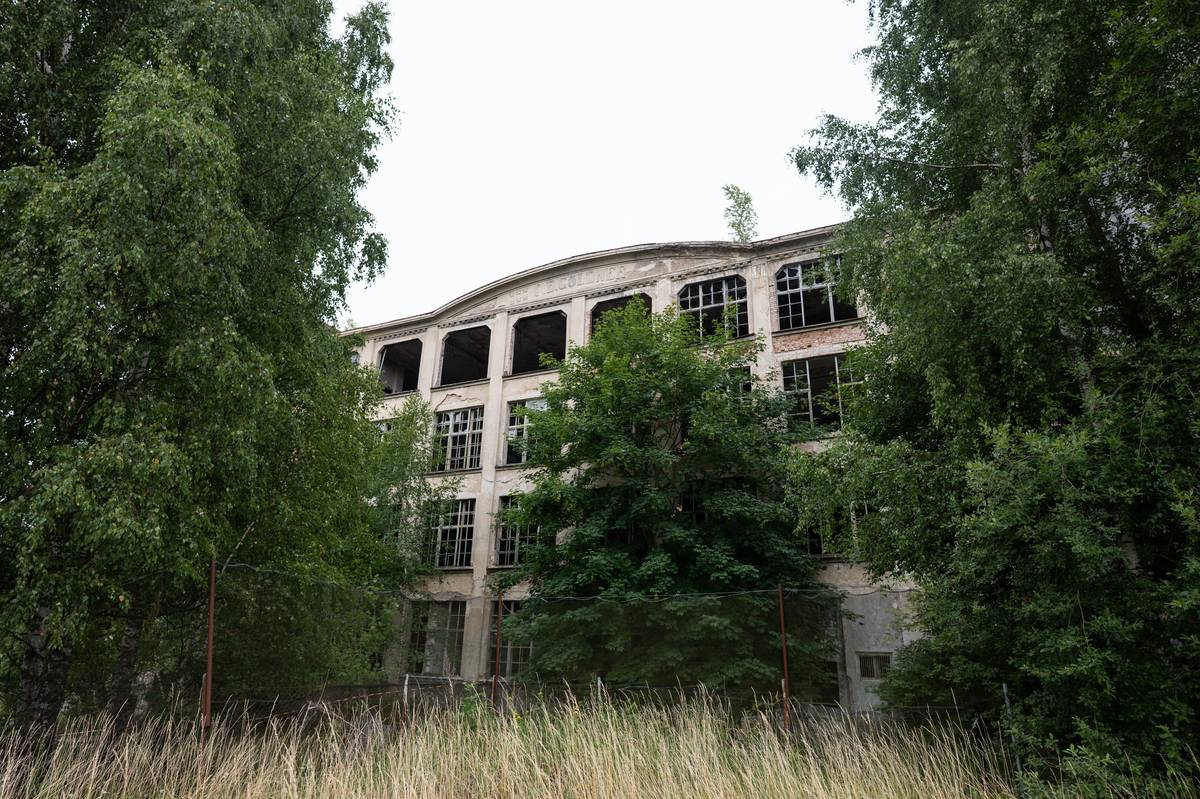 Při výhledu z okénka zaujme, v krajině nepřehlédnutelná, jak jinak, chátrající tovární budova.