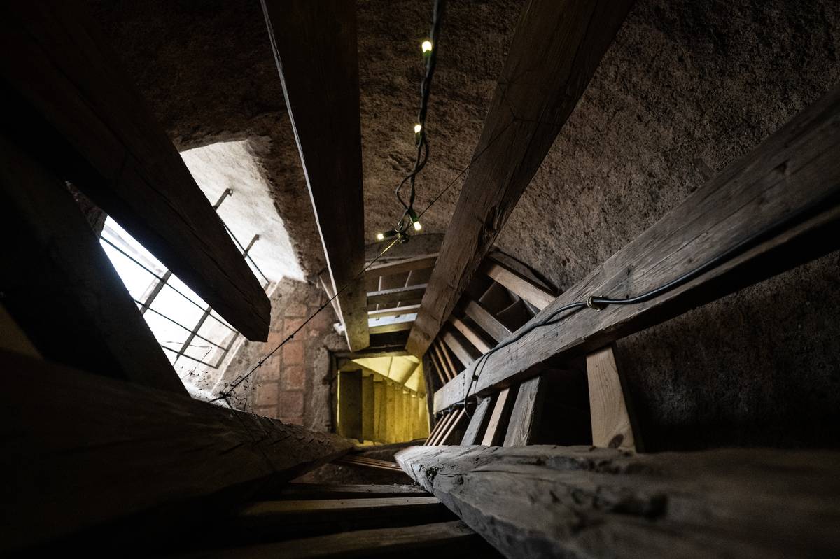 Sportovci mohou vyběhnout točité schodiště věže, která místo výhledu do krajiny nabízí detailní pohled na zvony.