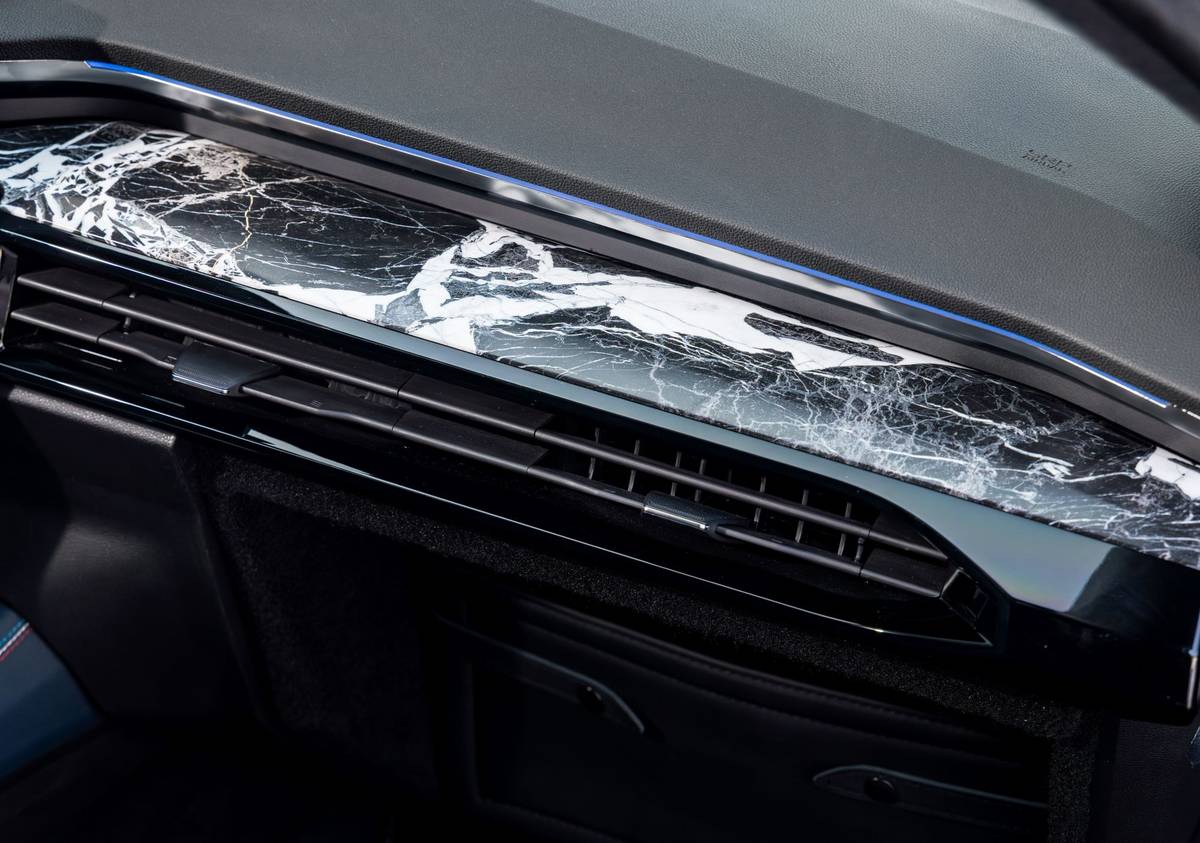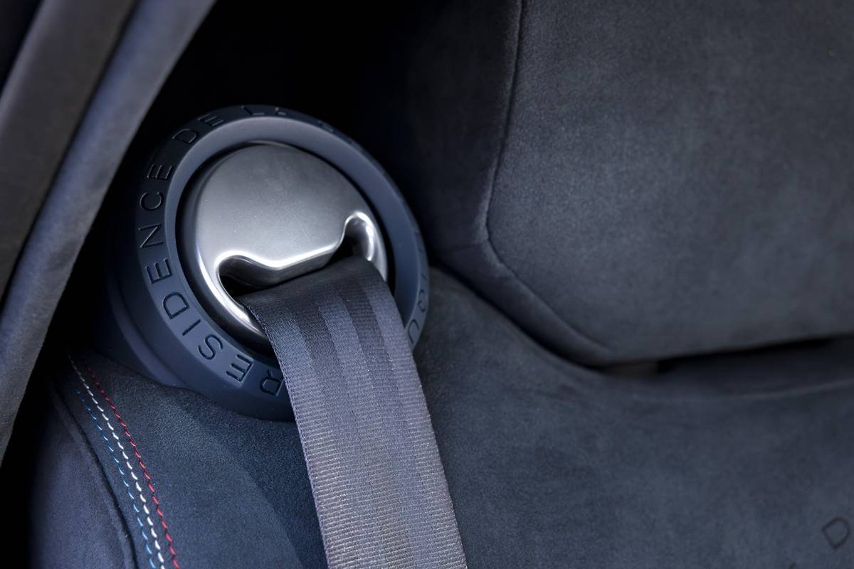 Čalounění kombinuje kůži, Alcantaru a prošívání v barvách trikolory.