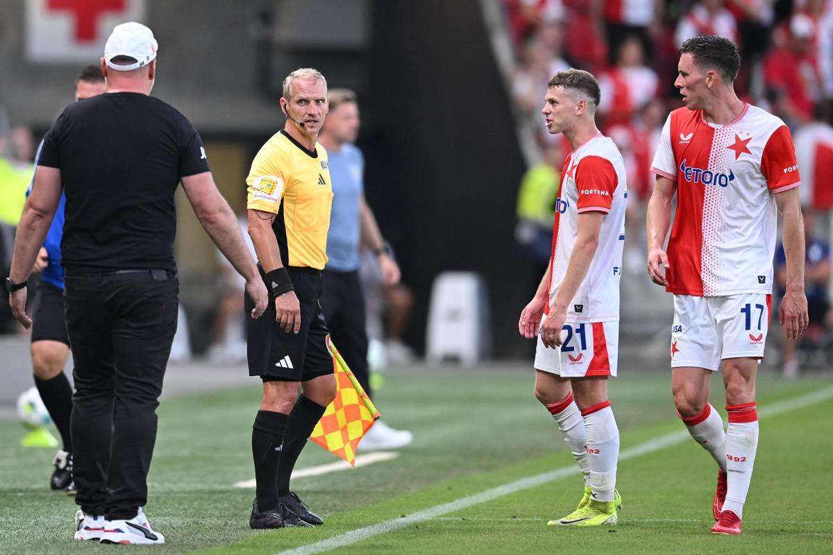 Trenér Slavie Jindřich Trpišovský a hráči Slavie řeší s čárovým rozhodčím sporný moment v zápase proti Hradci.
