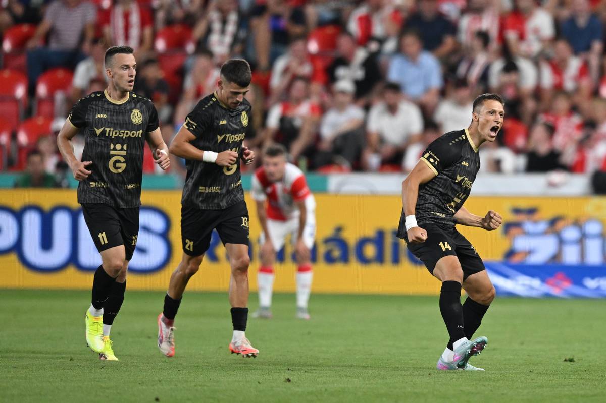 Jakub Hodek (vpravo) z Hradce Králové se raduje z vyrovnání proti Slavii