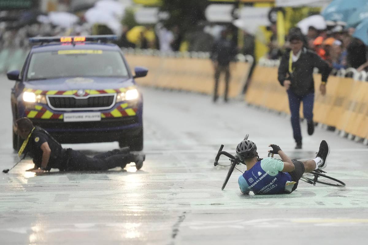 Záškodník sice měl dres týmu Decathlon AG2R, ale do týmu podle postavy ani vybavení rozhodně nepatřil. I tak se dokázal vyhnout jednomu z pořadatelů.