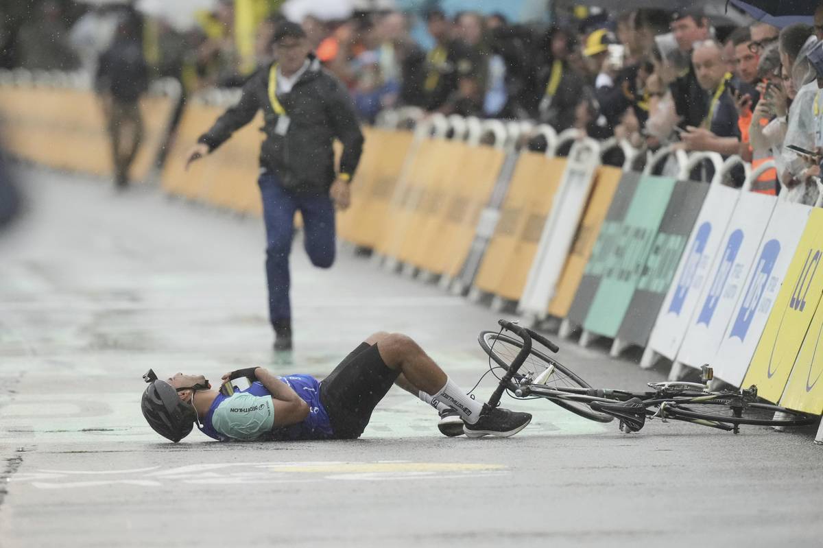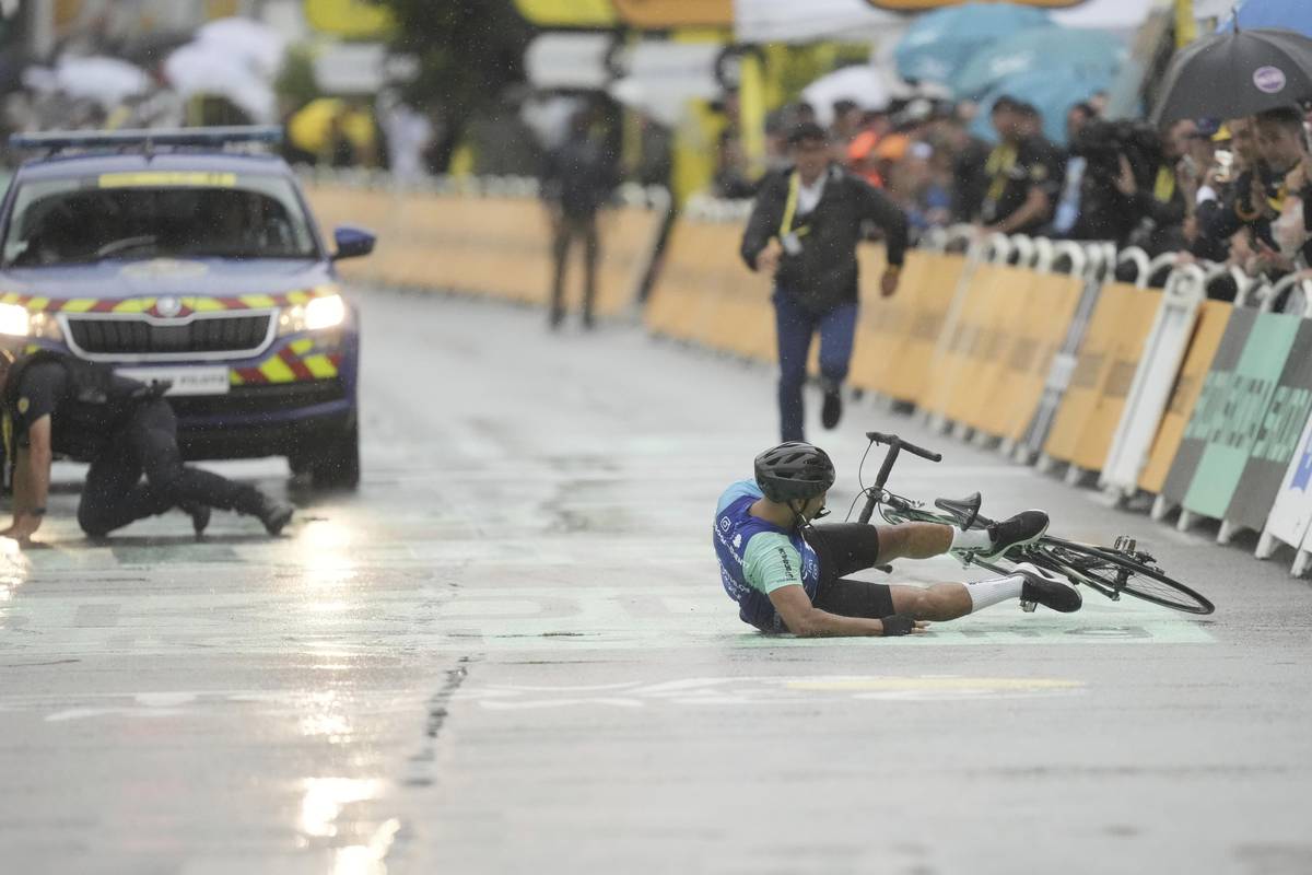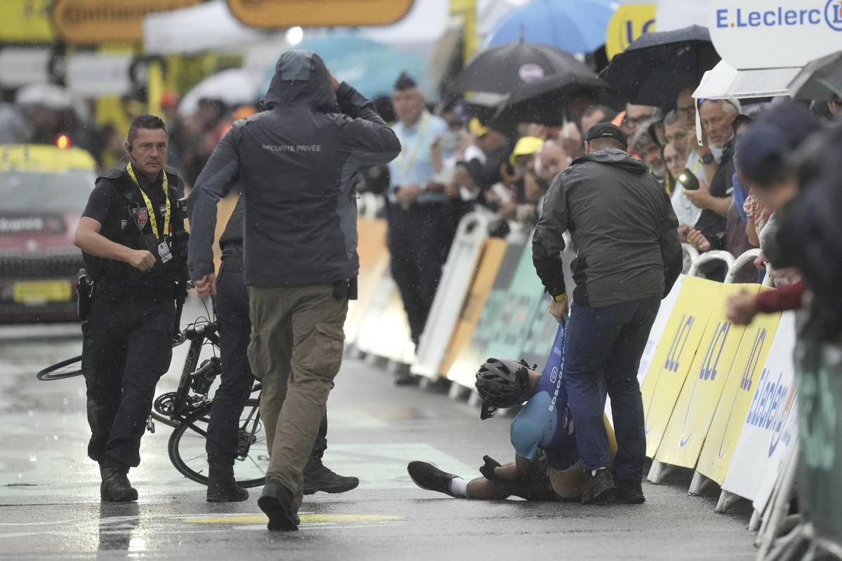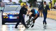 Tenhle tady nemá co dělat! Těsně před cílem 17. etapy do cílové rovinky skočil jeden z diváků. I s kolem.