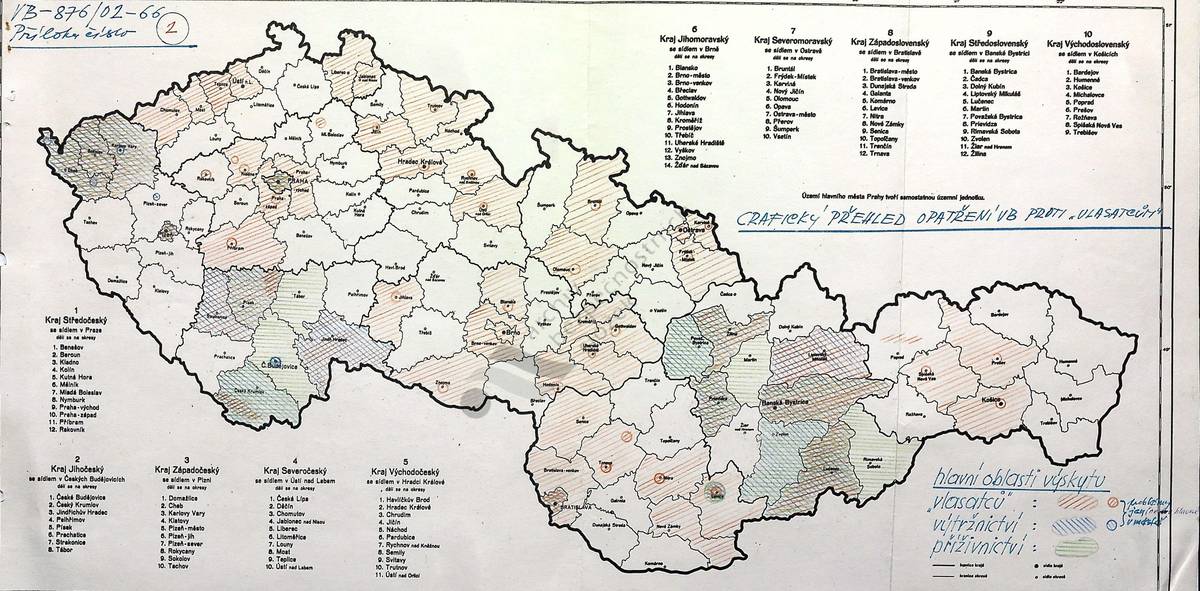 Bizarní mapa Veřejné bezpečnosti z roku 1966 zobrazující celorepublikový výskyt „vlasatců“.