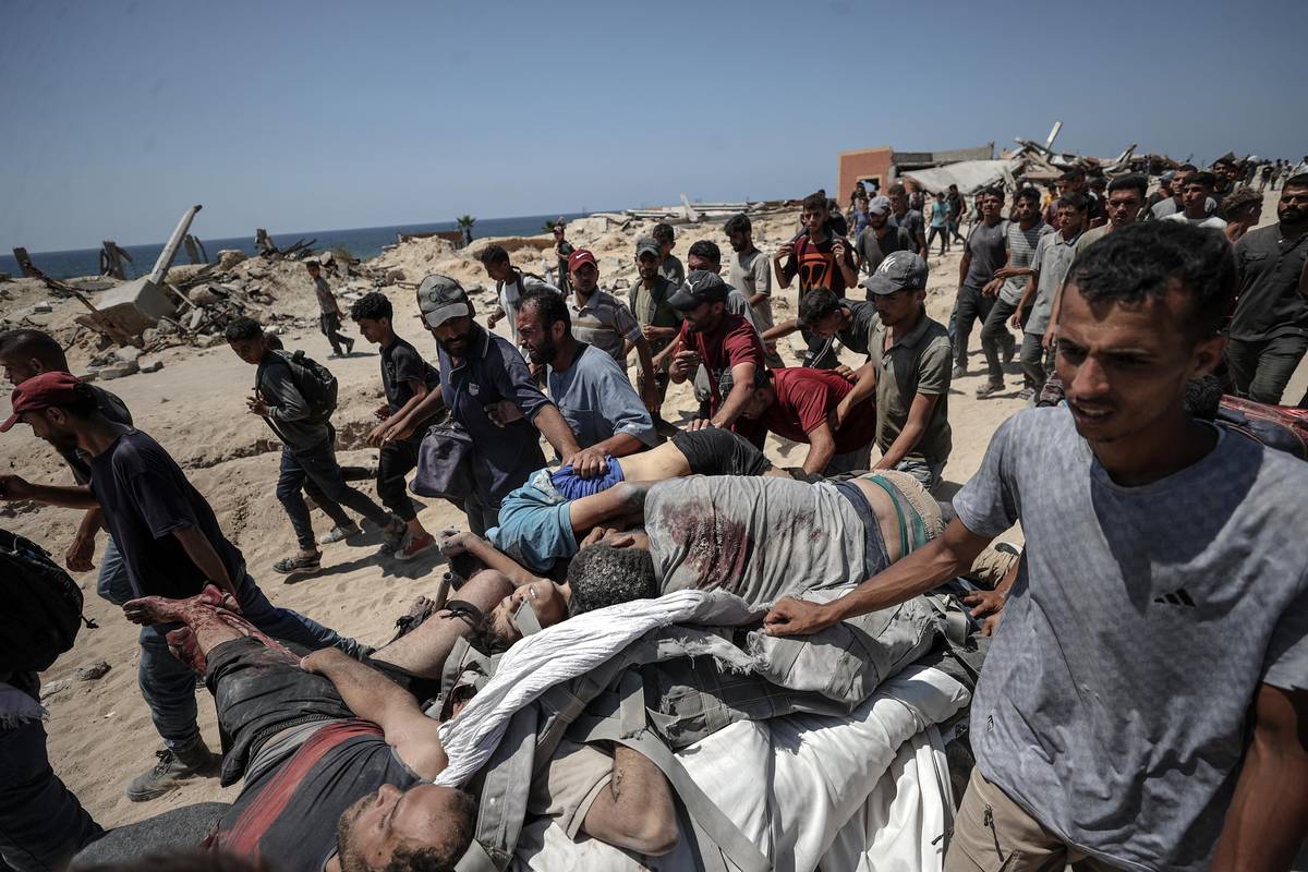 (Převoz zraněných Palestinců postřelených při čekání na humanitární pomoc do nemocnic, 20. července, oblast Zikim.)