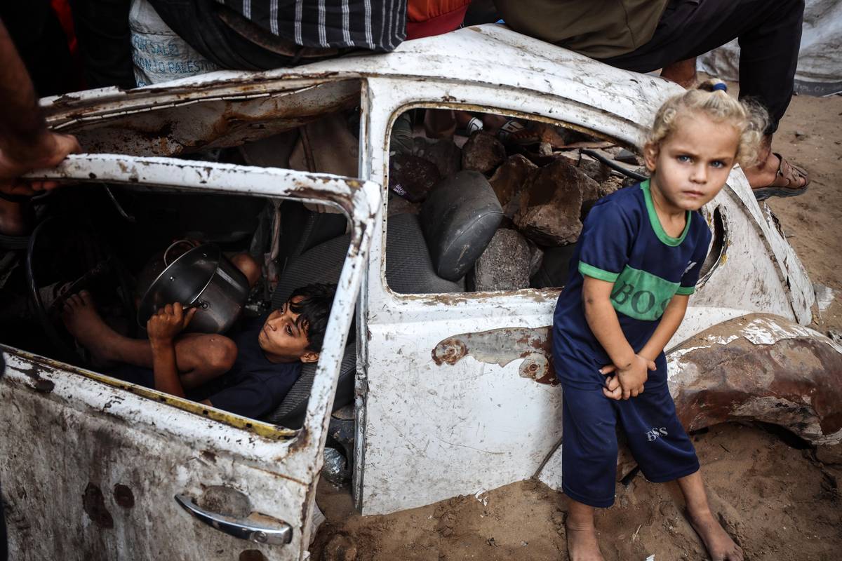 (Palestinské děti čekají ve frontě na porci teplého jídla, které rozdává charitativní kuchyně v Gaze, 20. července.)