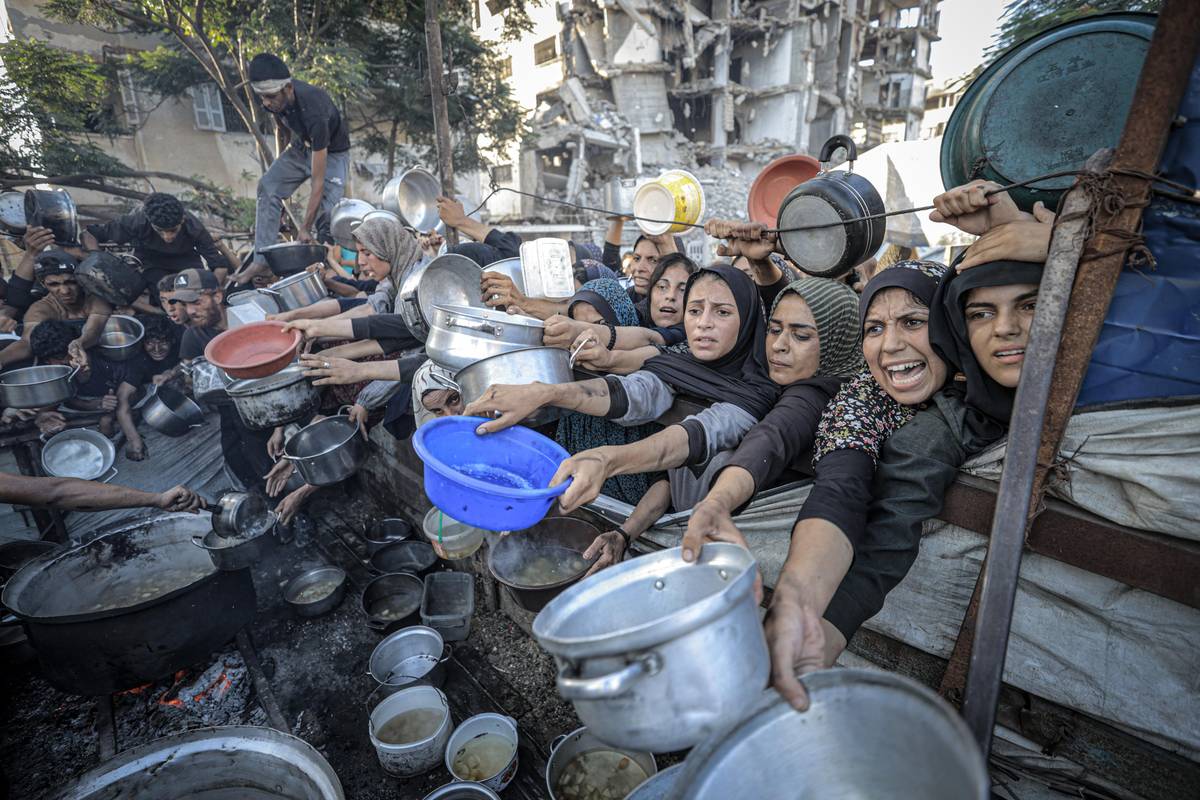 (Fronta na teplé jídlo distribuované charitativní organizací ve městě Gaza, 20. července.)